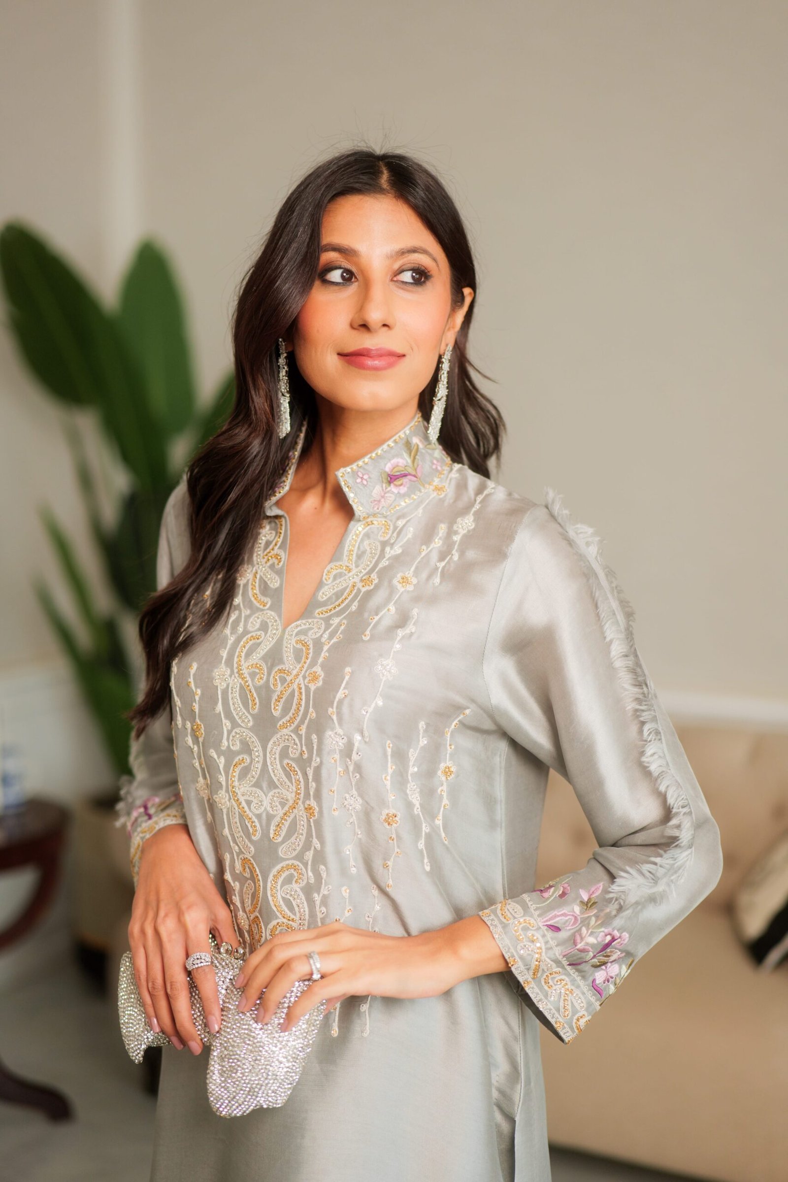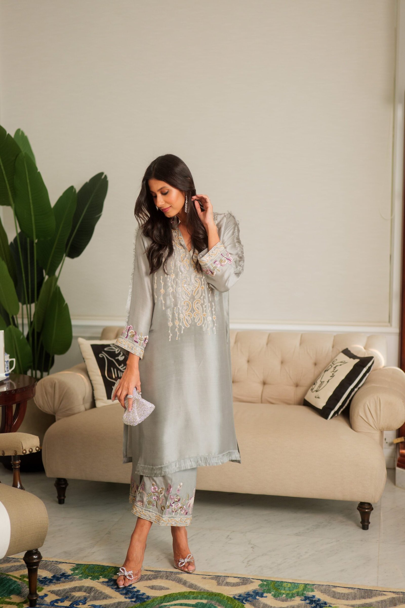 Pure sheesha silk shirt adorned with an intricate air and resham embroidery with atouch of hand work to complete the look .Paired with a silk embroidery izzar.