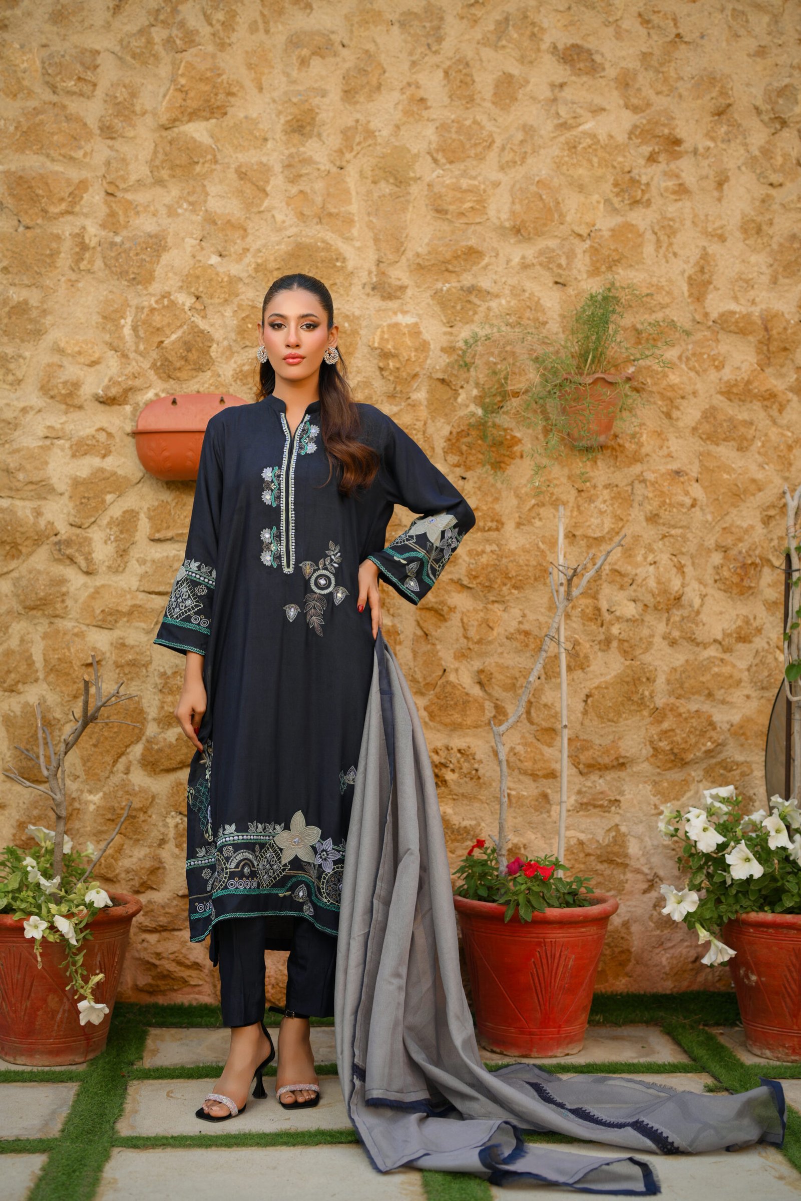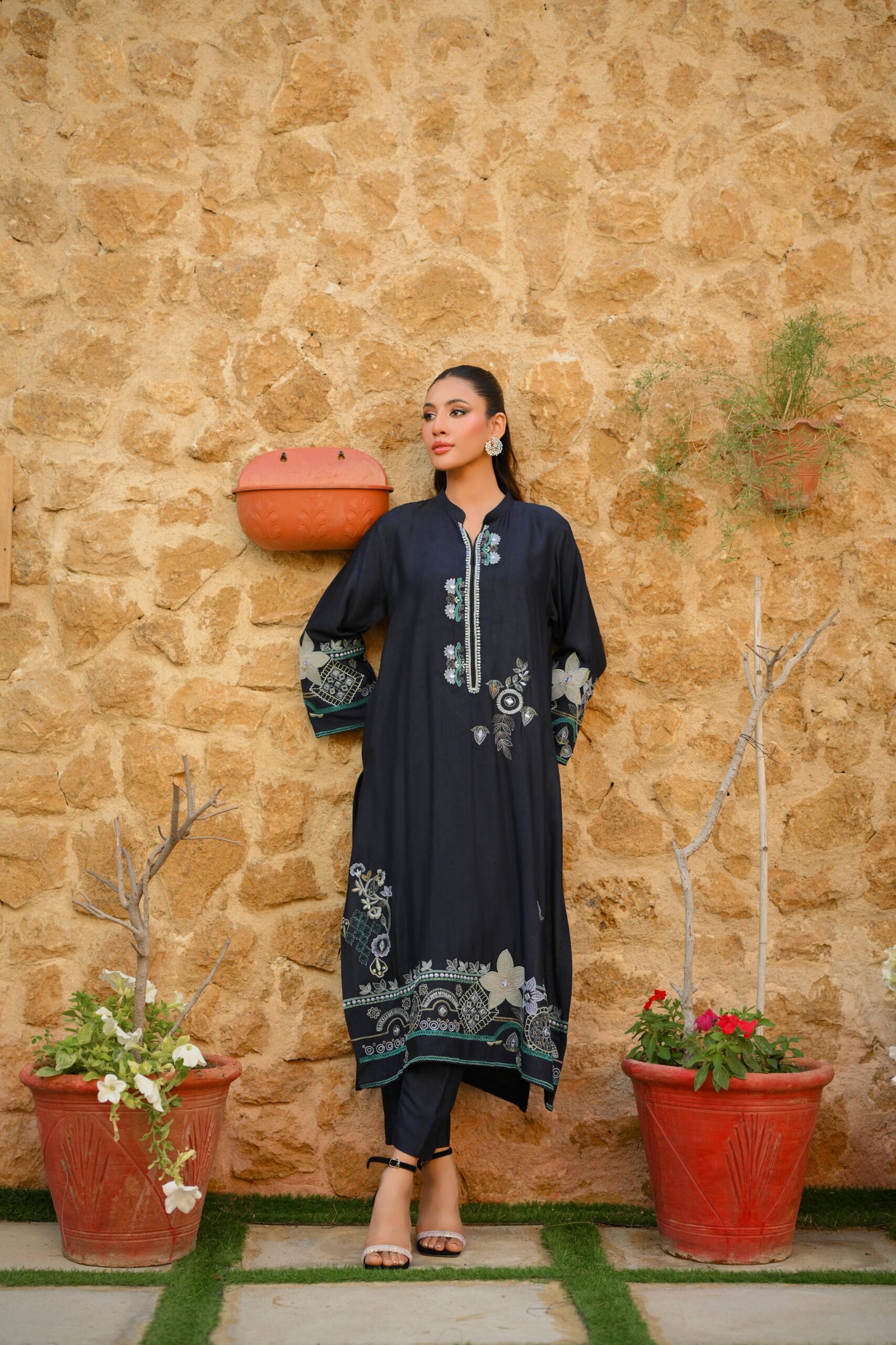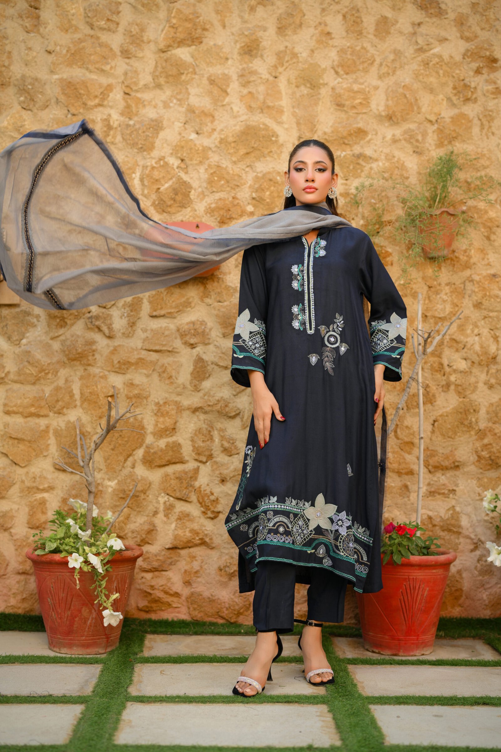 A pure Khaadi silk shirt is detailed with appliqué embroidery with mirror work . Paired with matching pants and Khaadi net contrast dupatta