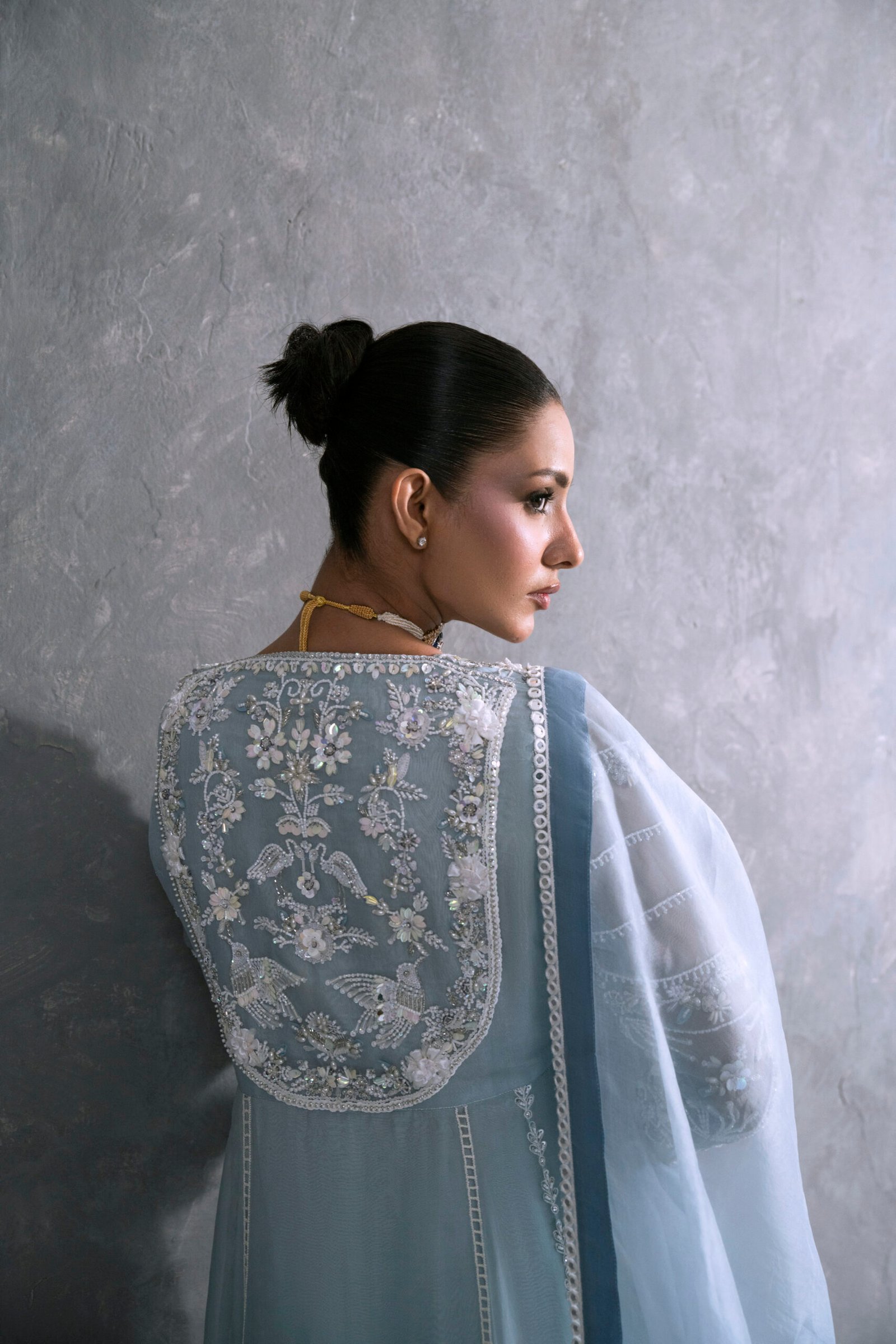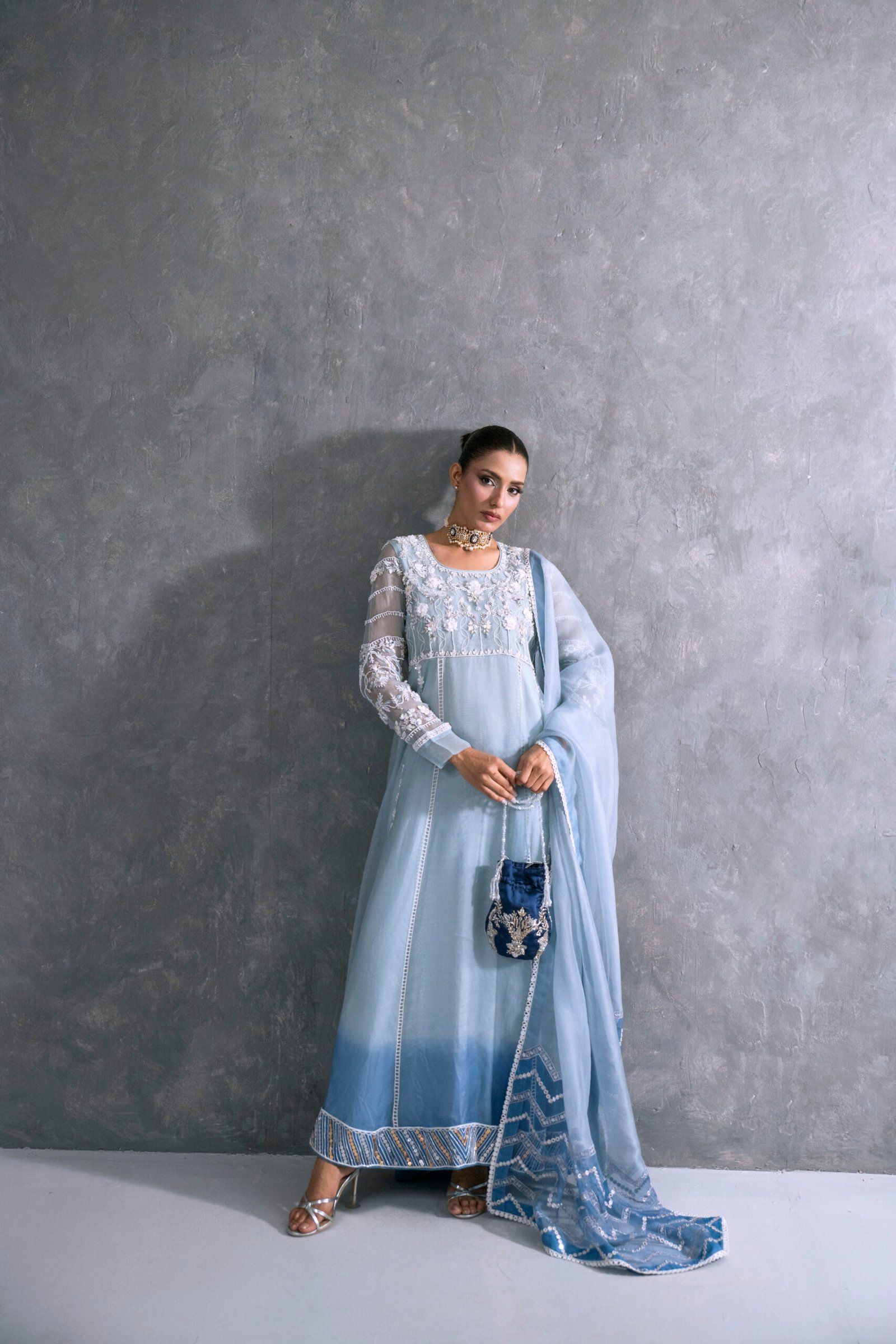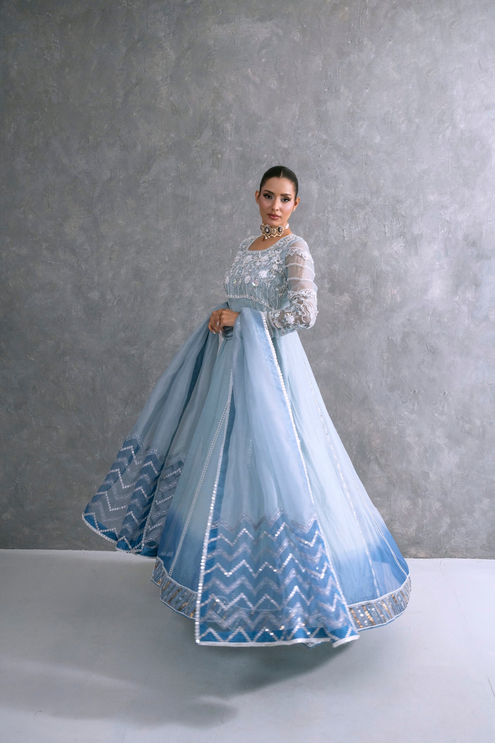 Shirt: Pure organza blue Kalidaar Peshwas, heavily embellished bodice work with sequence, cut dana and resham elevates the look with glamour and richness. Work on daman completes the look.