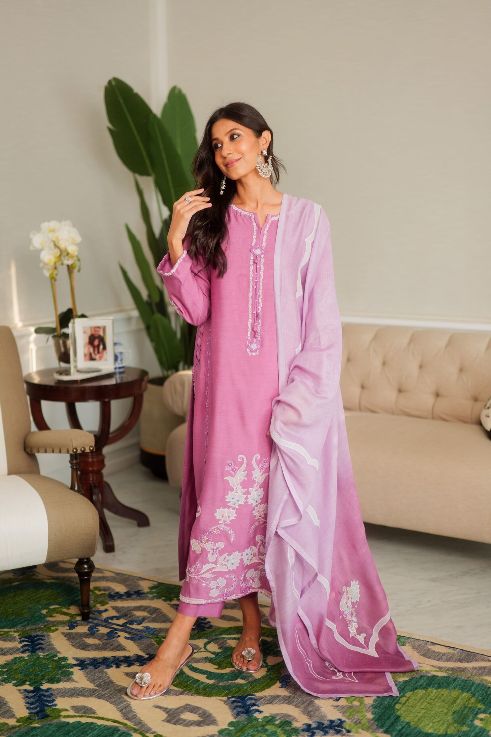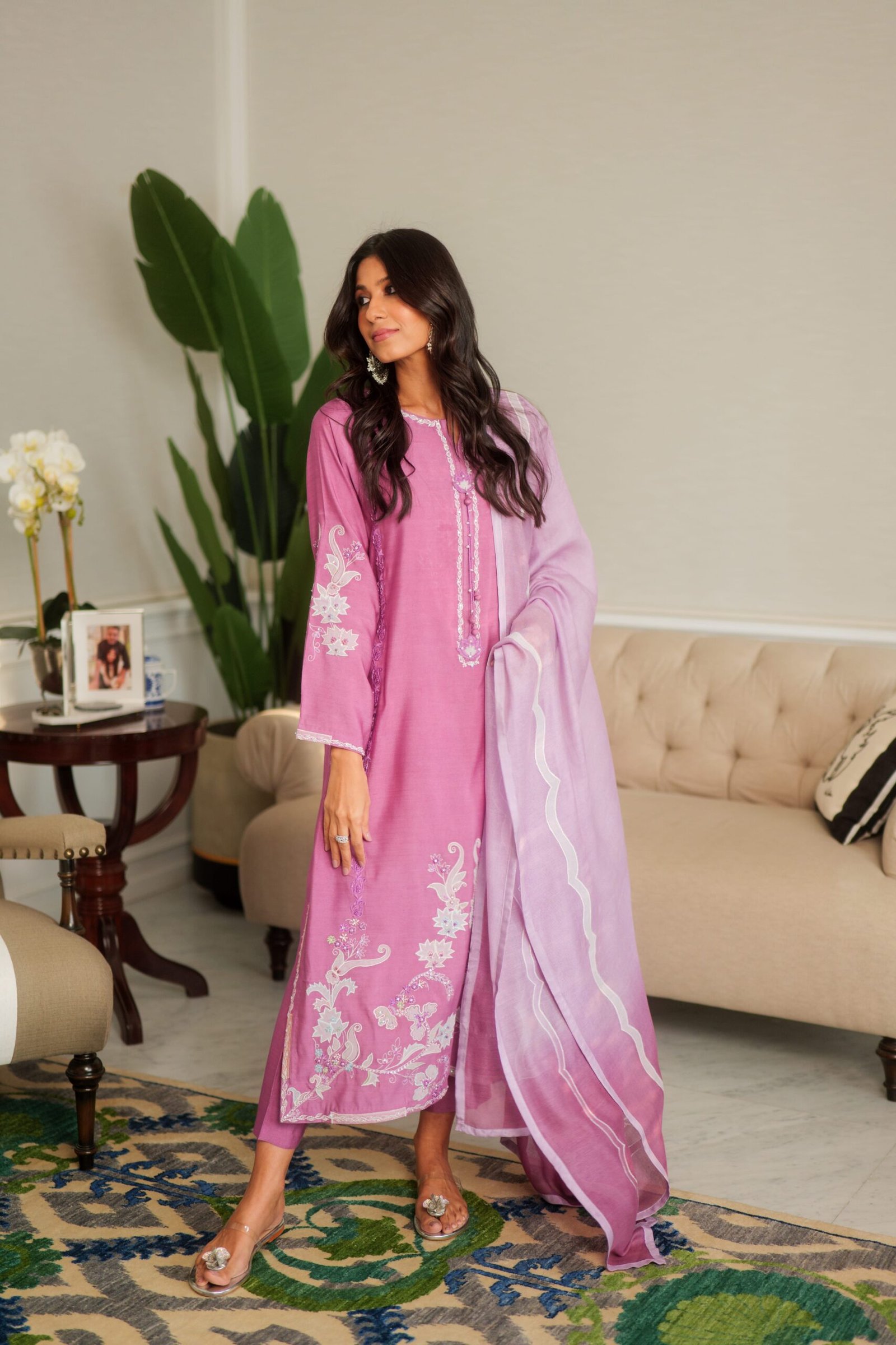 Pure khaadi silk set adorned with intricate applique, resham and hand embroidery. Paired with matching pants and pure khaadi net dupatta to finish.