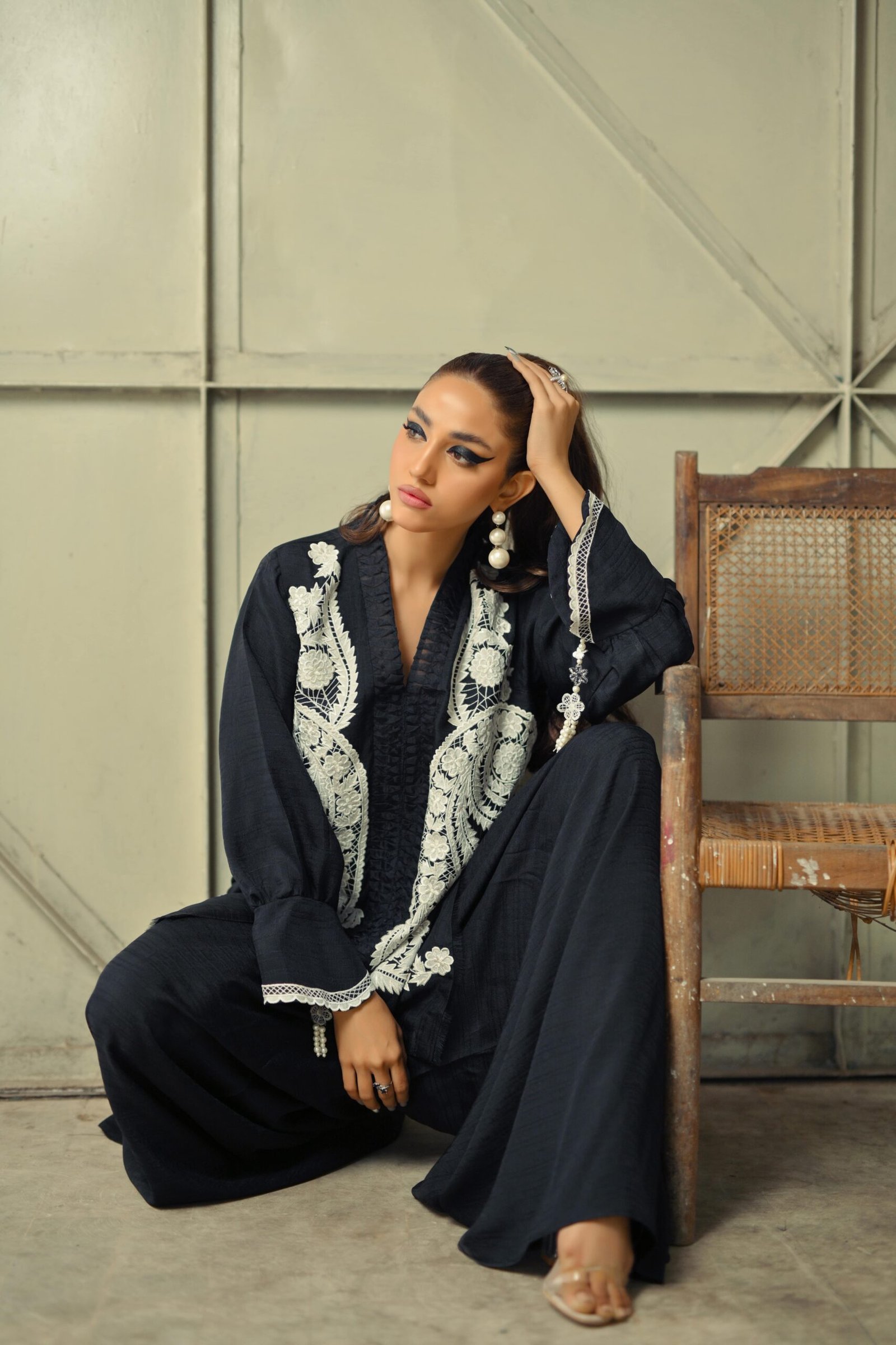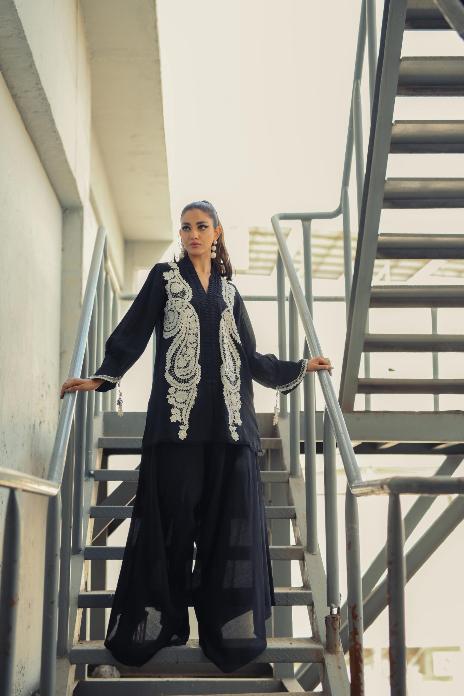 Pure crepe silk with cut work and applique machine embroidery, finished with tassels on sleeves.