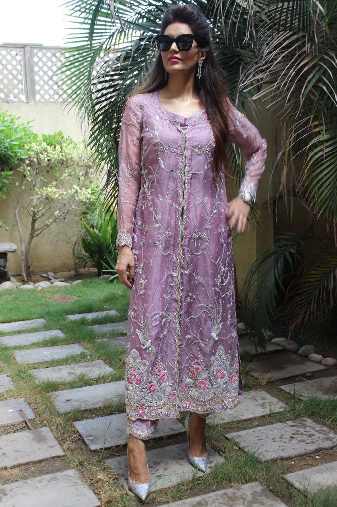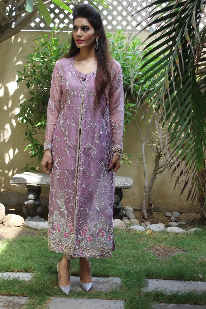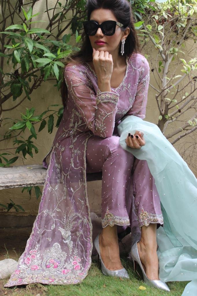 3 piece set with a front open style pure organza shirt heavily worked with silver and gold dabka, naqshi and sequins. Paired with pure organza dupatta that is worked with motif and sequin spray.
