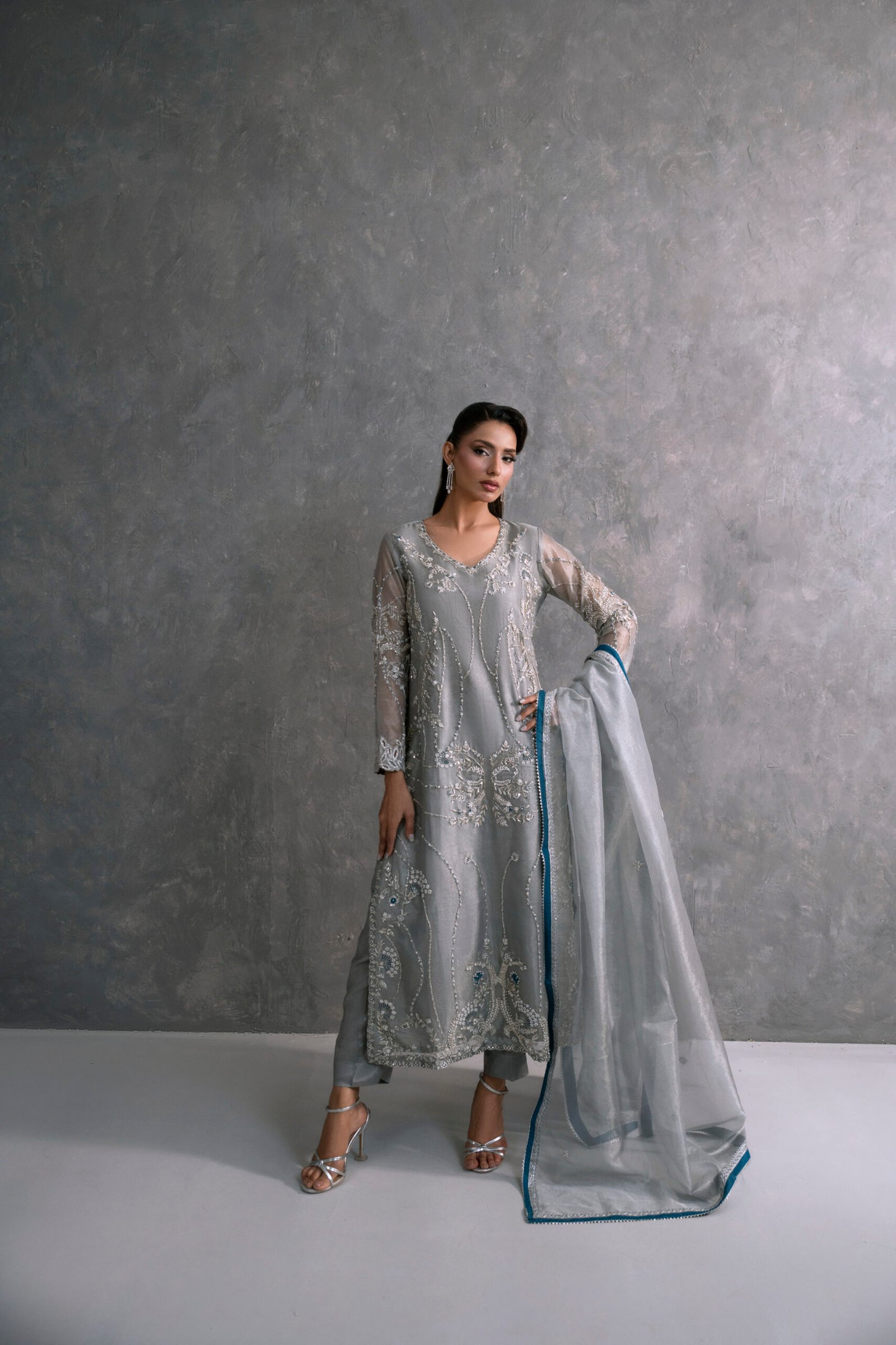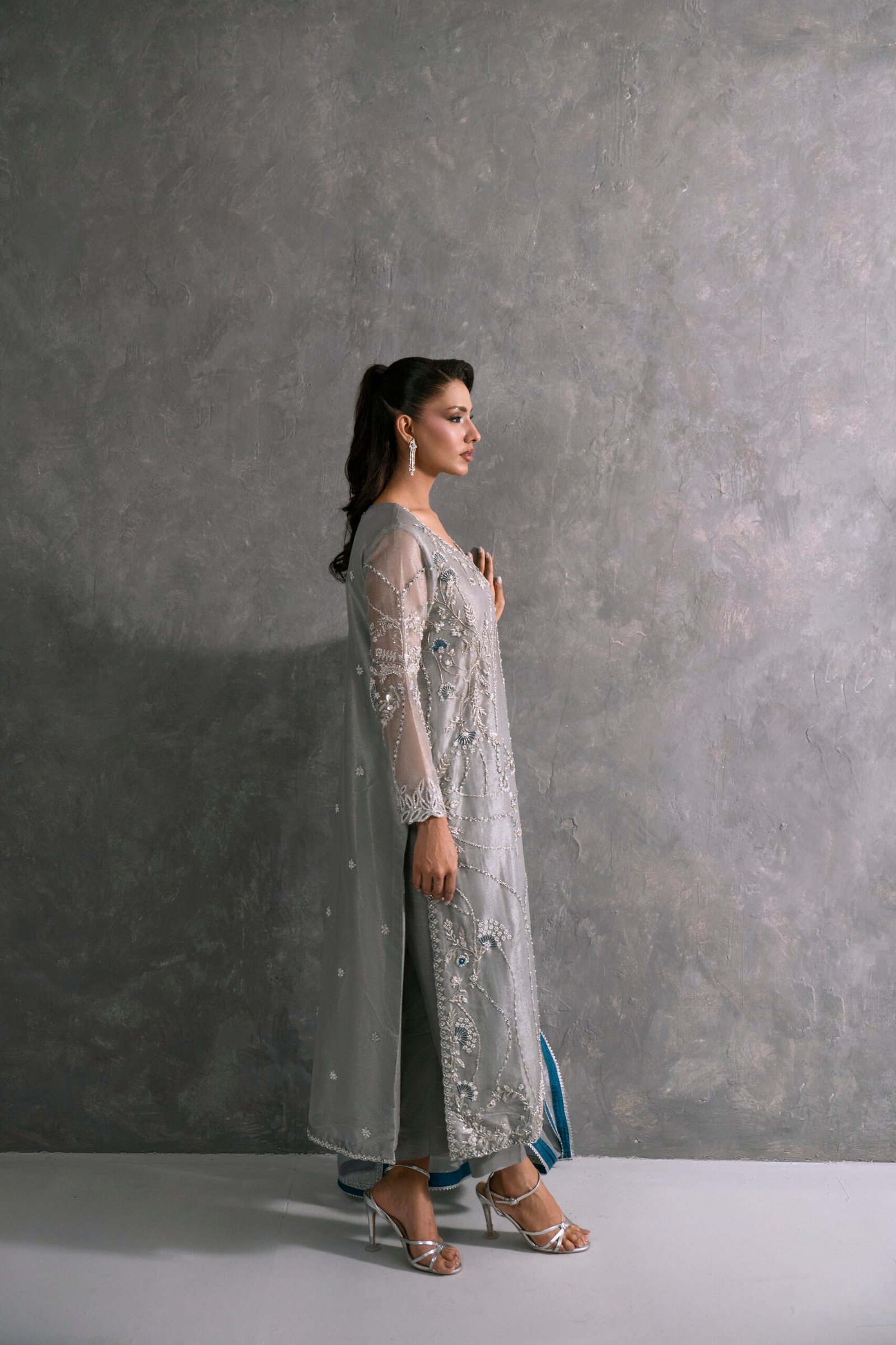 Shirt: Greyish silver Lama tissue shirt with silver Zardozi work with teal Resham handwork creates an ethereal and luxurious look. Cut work details on the sleeves adds richness and opulence.