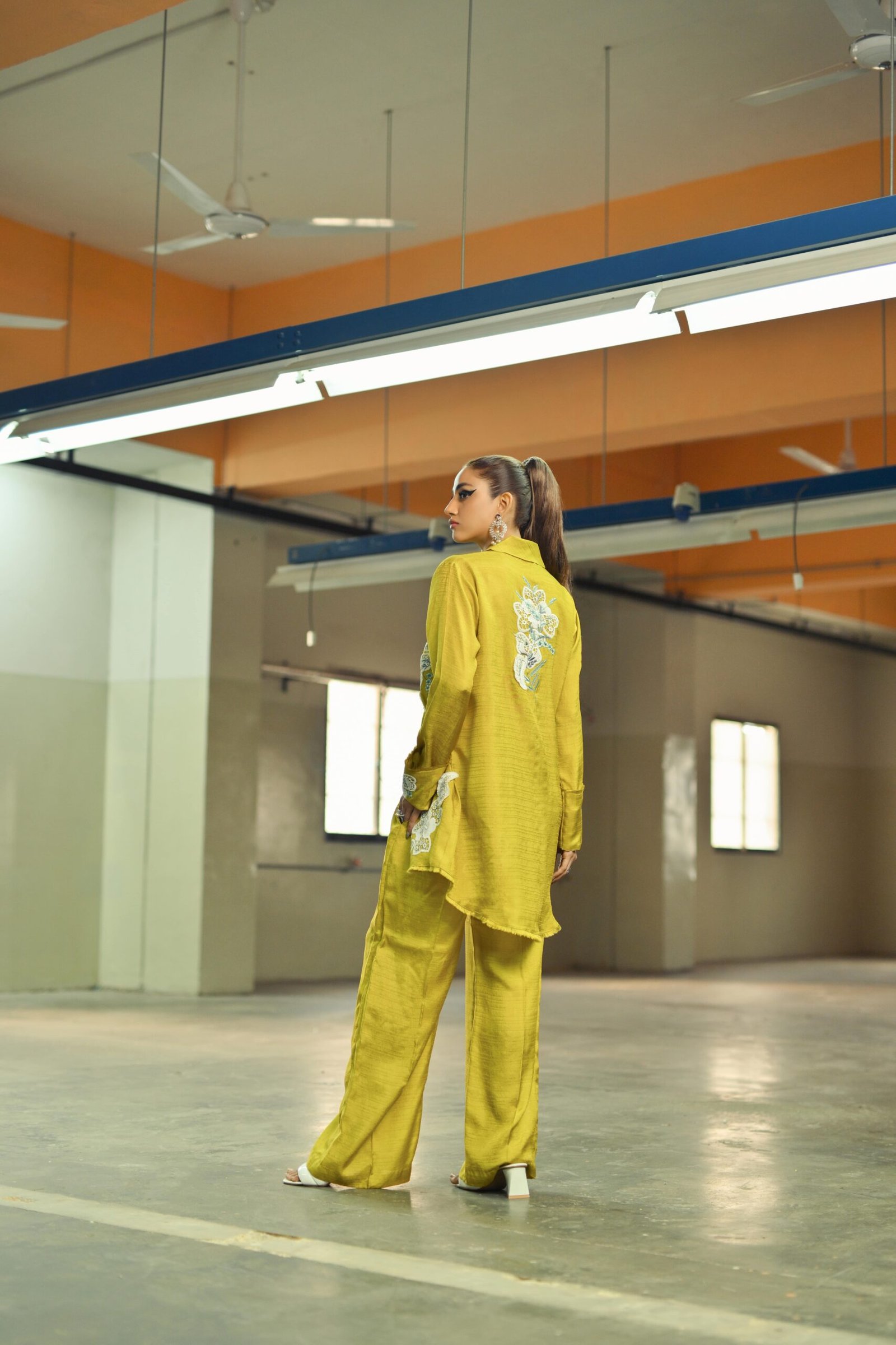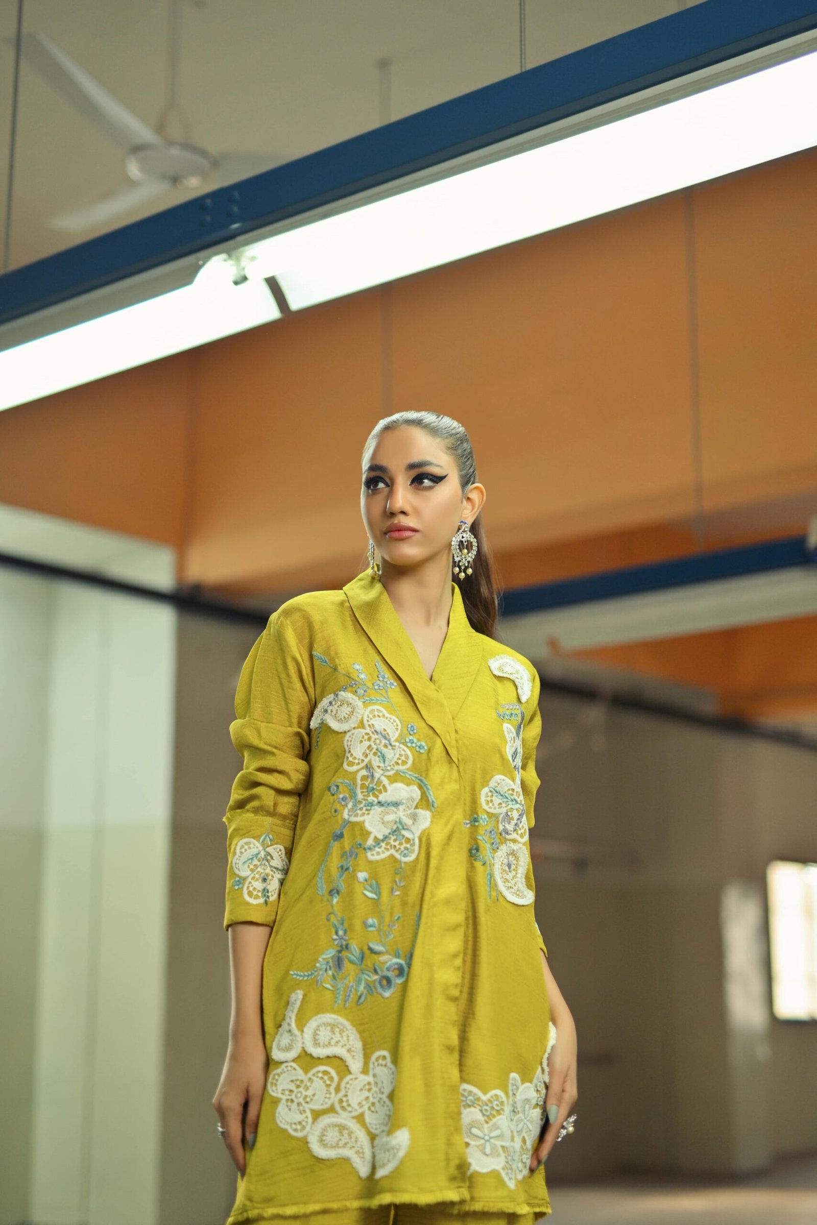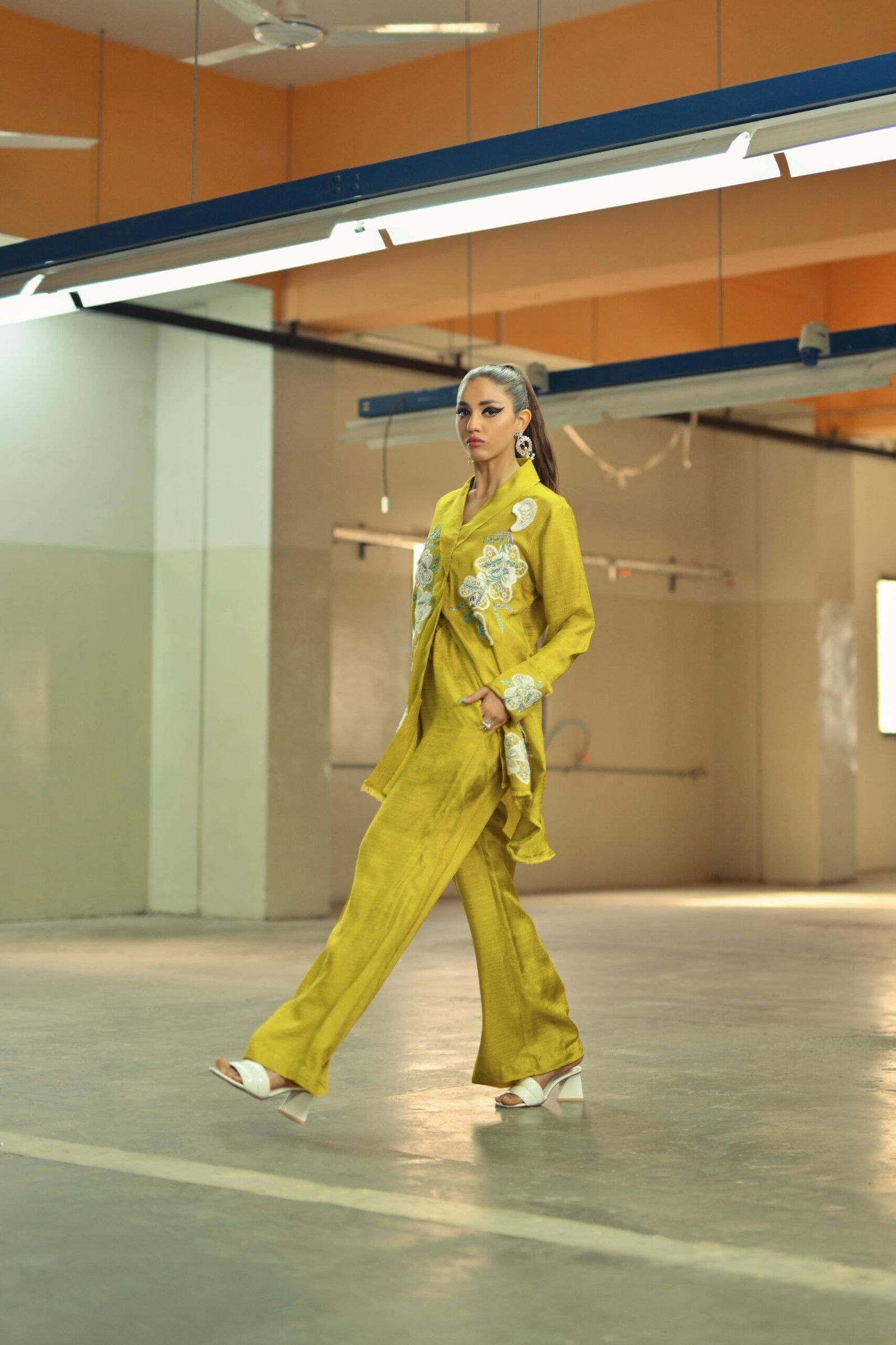 Pure crepe silk set with machine, cutwork and applique embroidery.