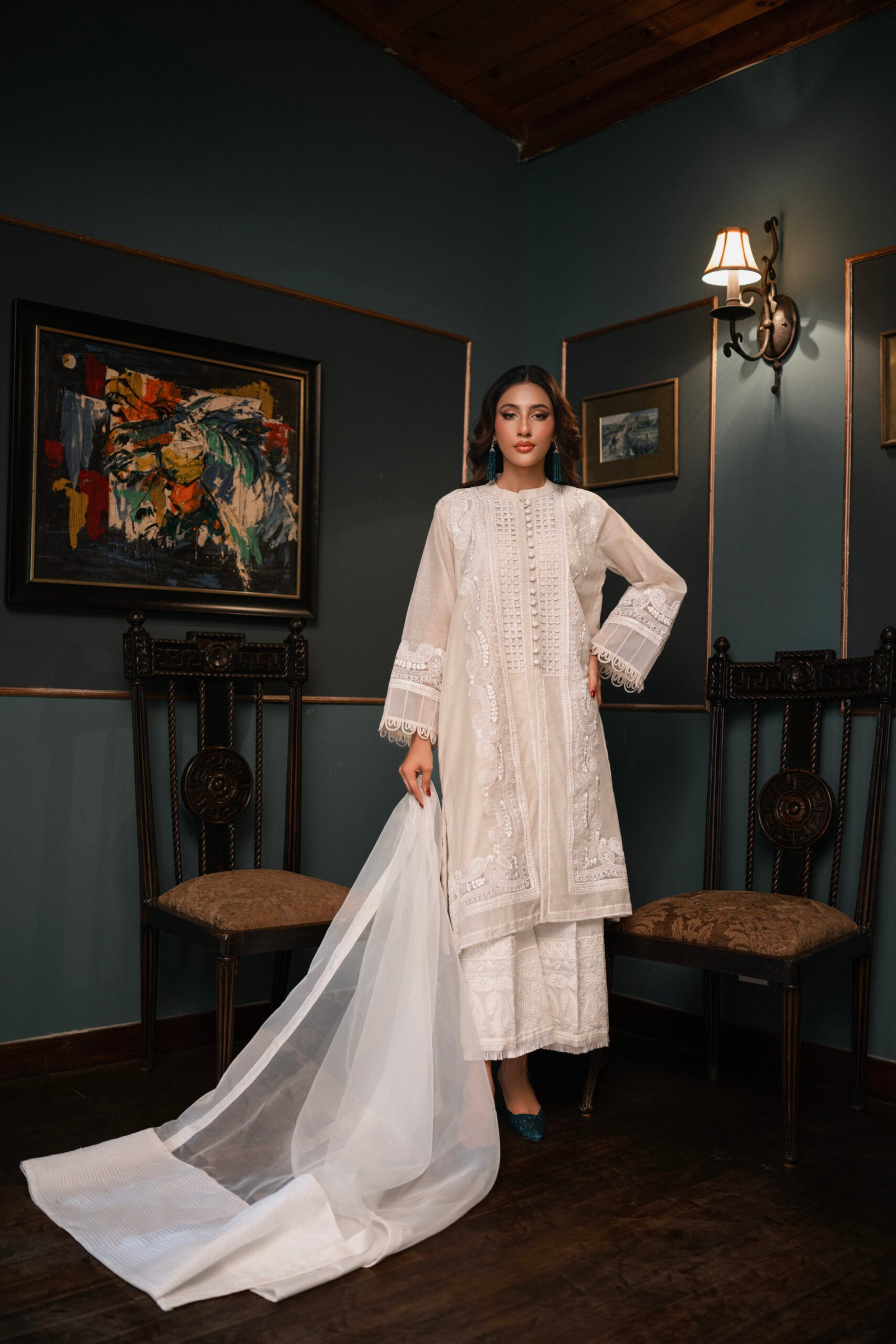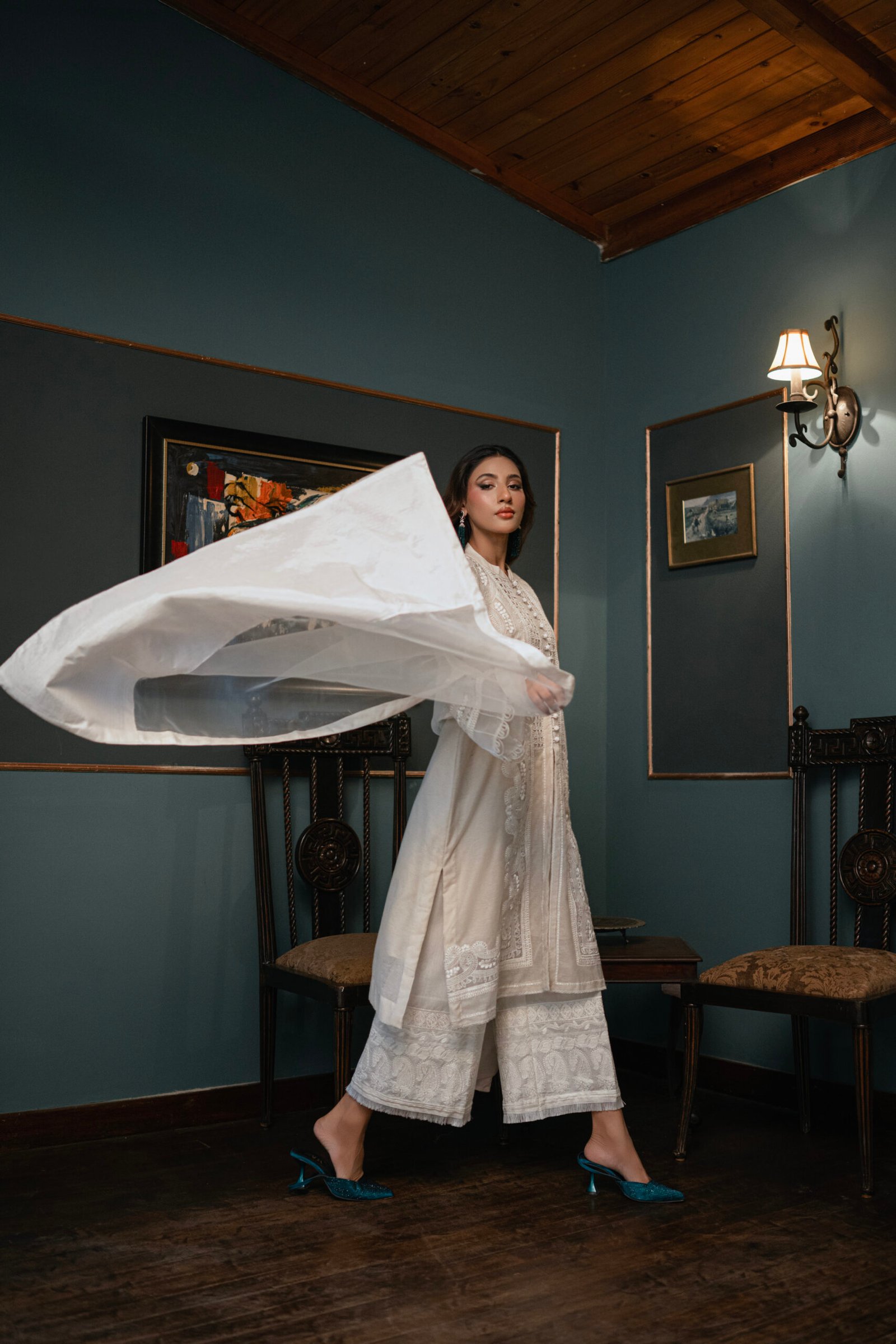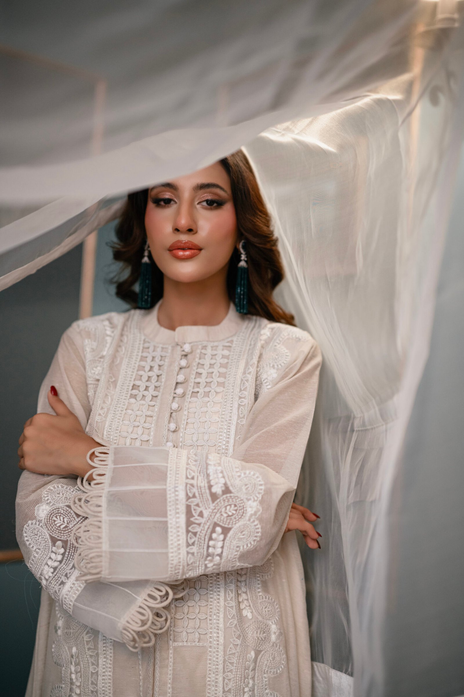 An ivory ensemble radiates grace with a sheer Khaadi corduroy shirt with intricate Emboridary finished with scalloped of the sleeves. Paired with embroidery culottes, the design is balanced with organza dupatta