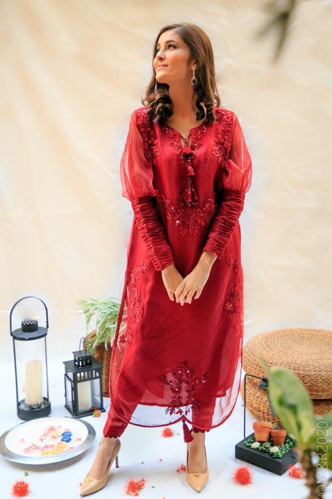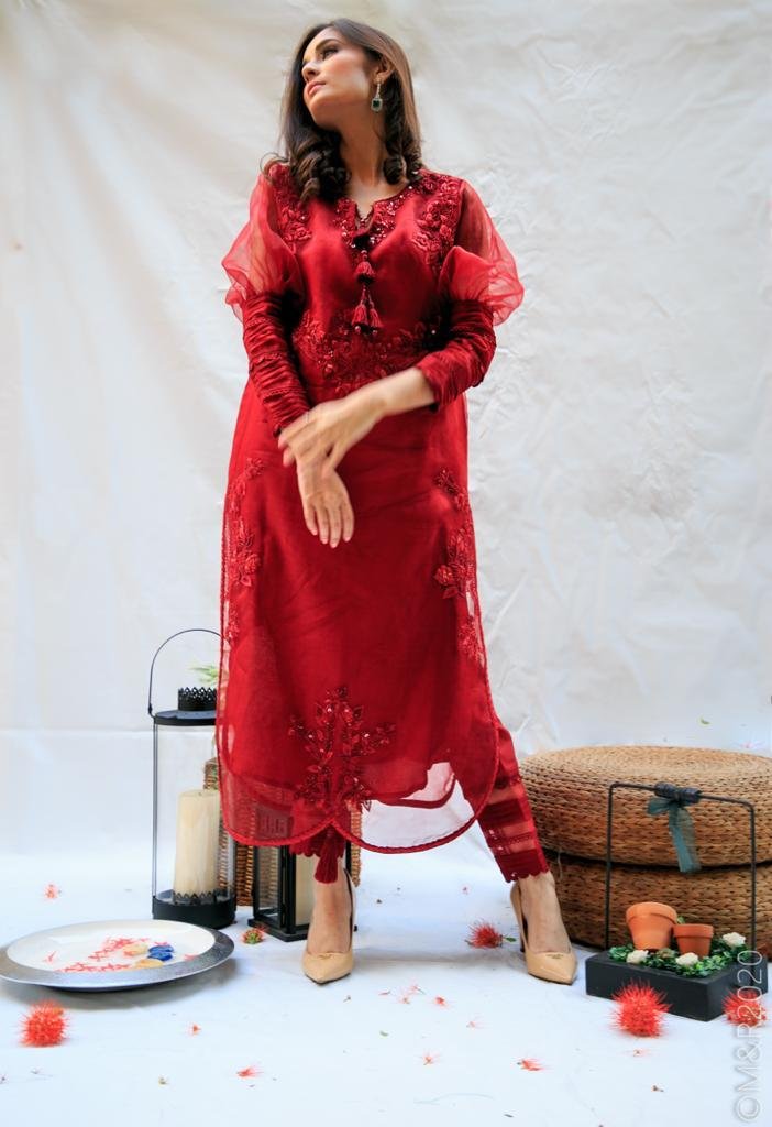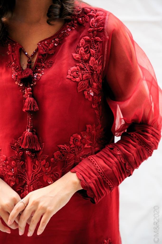 Maroon organza shirt with intricate machine and hand embroidery with lace and pleated cuff sleeves. Neck finish with the reshum tassels. Paired with semi pure silk pants.