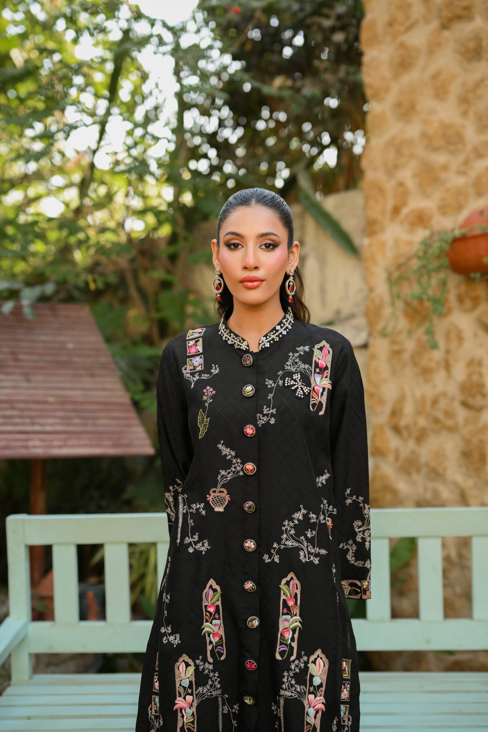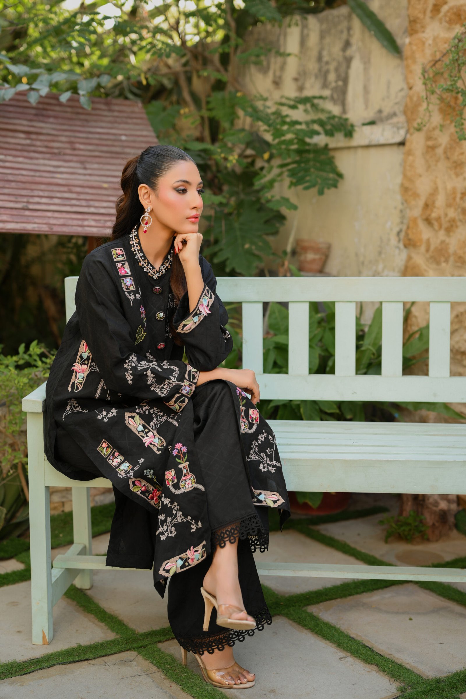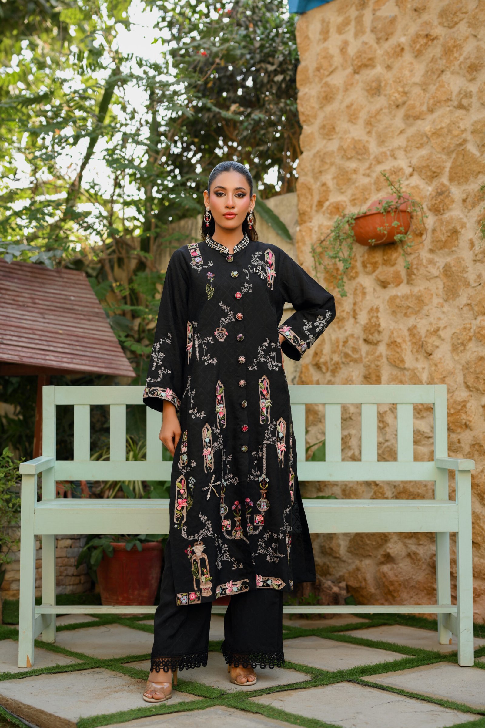 This statement coat captivates with its intricate colourful embroidery evoking a sense of regal opulence. Paired with matching loose pants with lace details