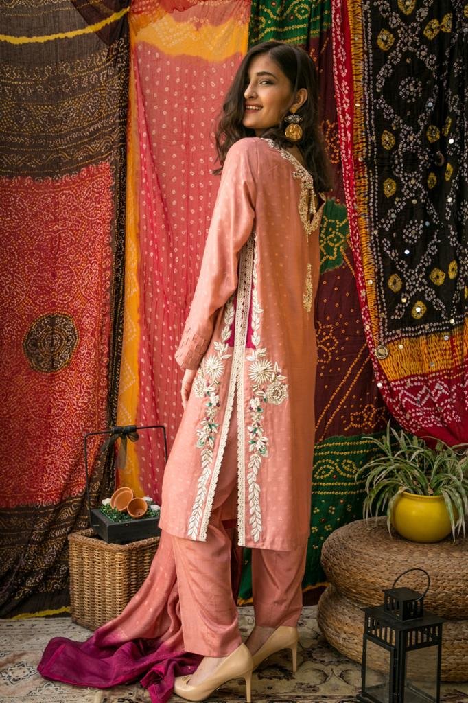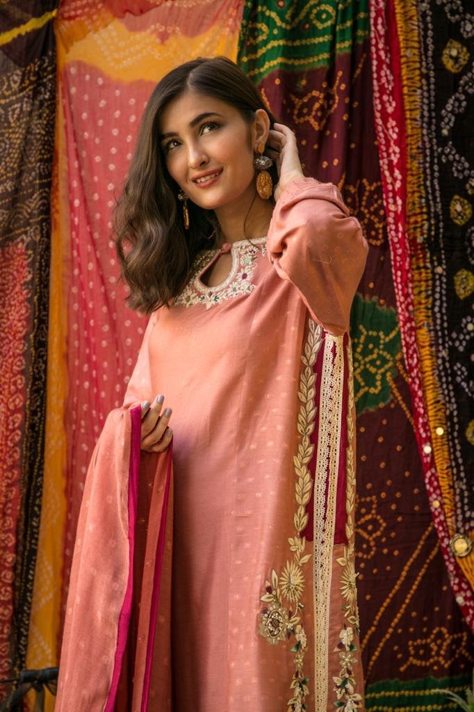 Cotton net shirt with embroidery. The shirt is paired with a shaded dupatta and semi pure pants.