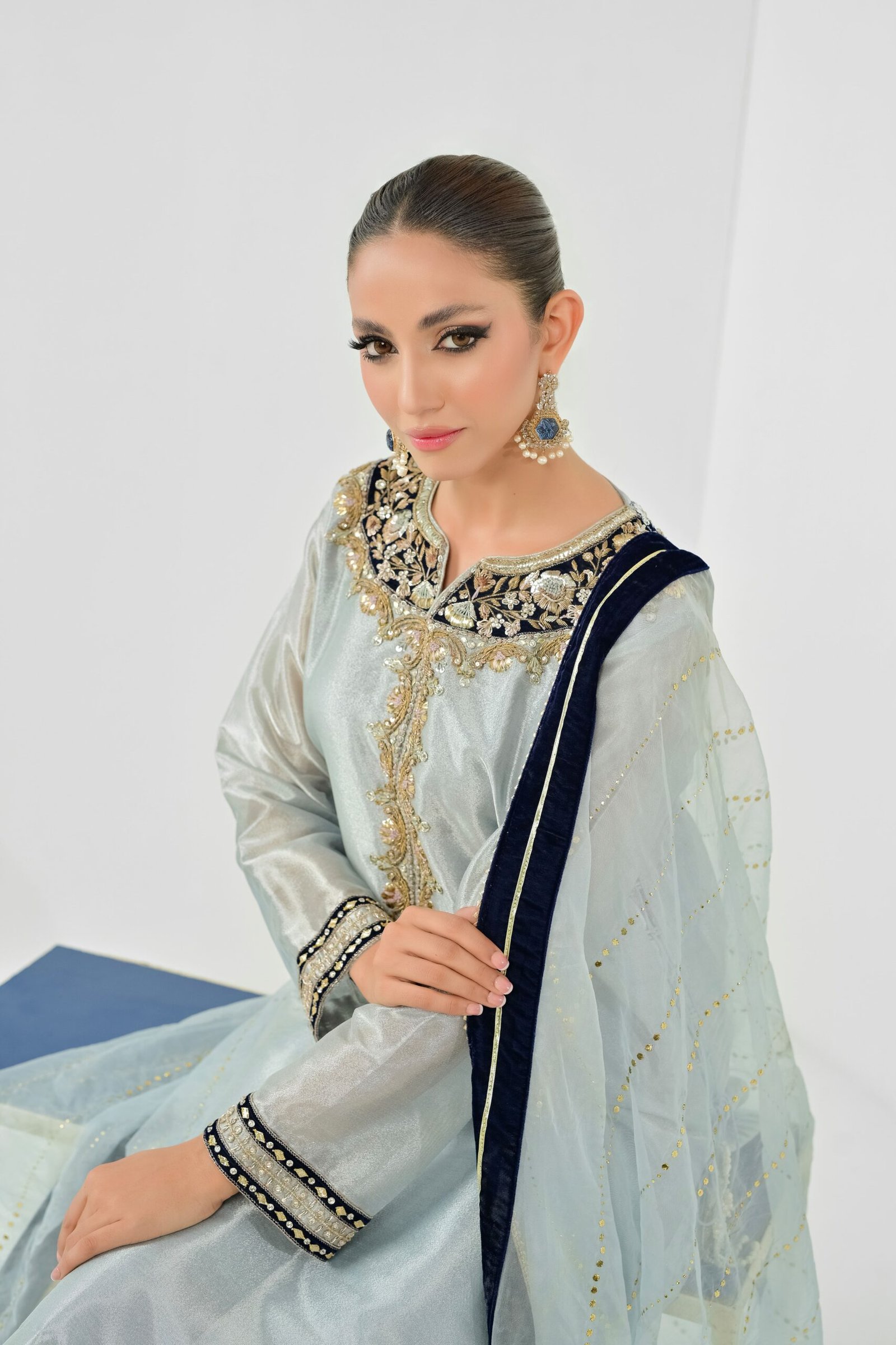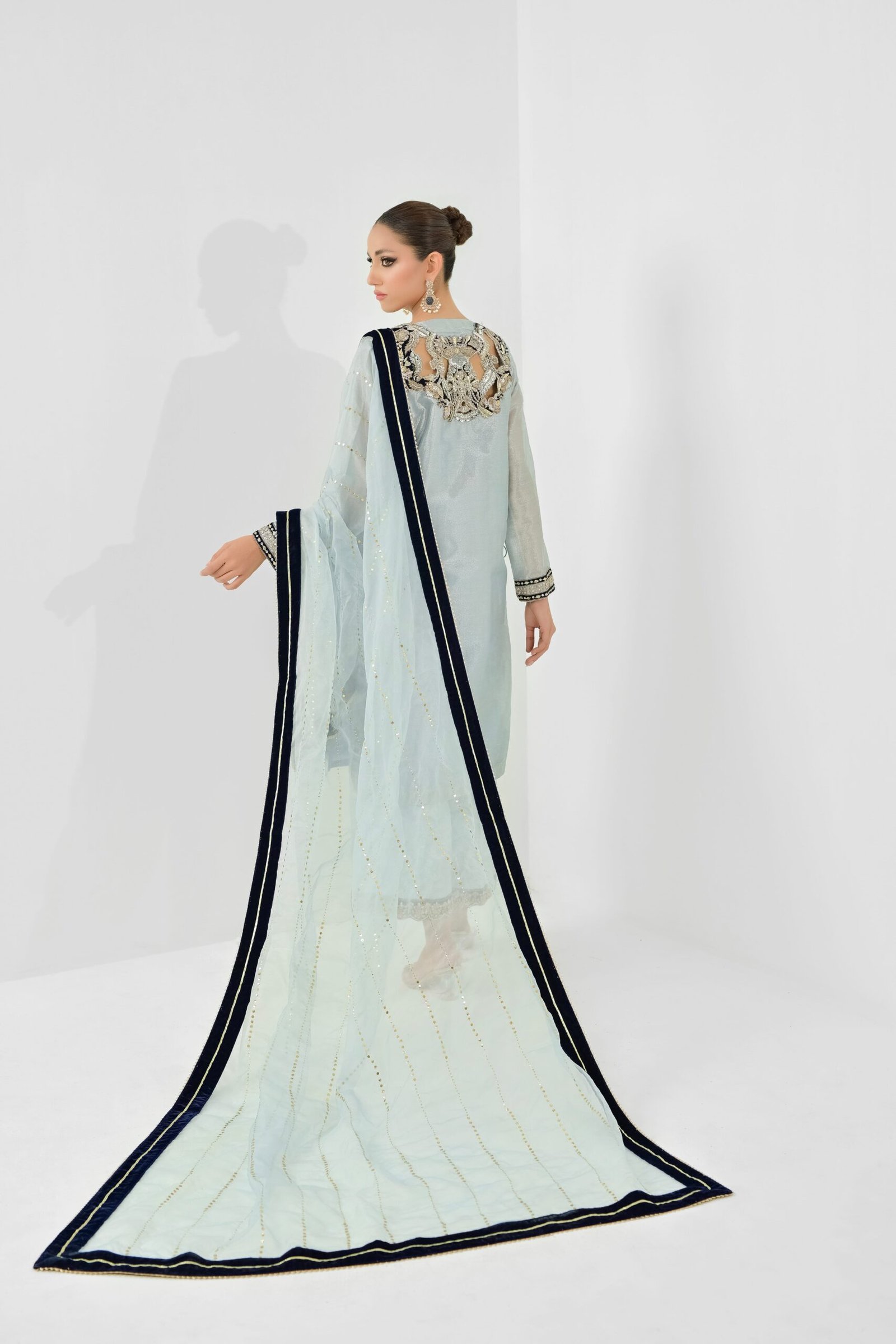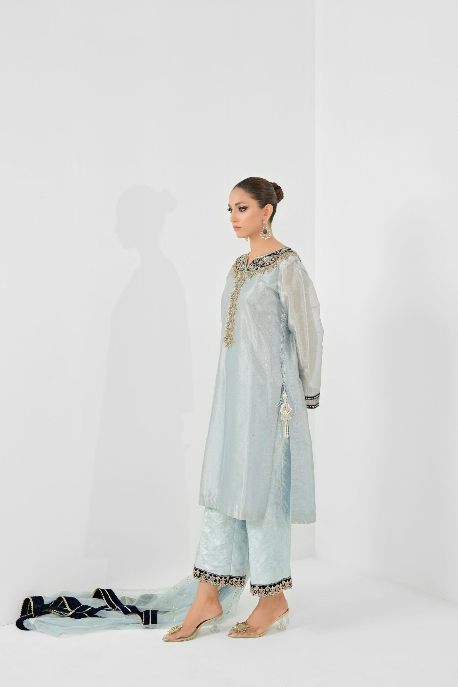 Powder blue llama sheet with velvet appliqué and delicate hand embroidery. Pairs with izaar work on the buttom and kaam dani organza dupatta. Finished with hand tessel on the side of the shirt.