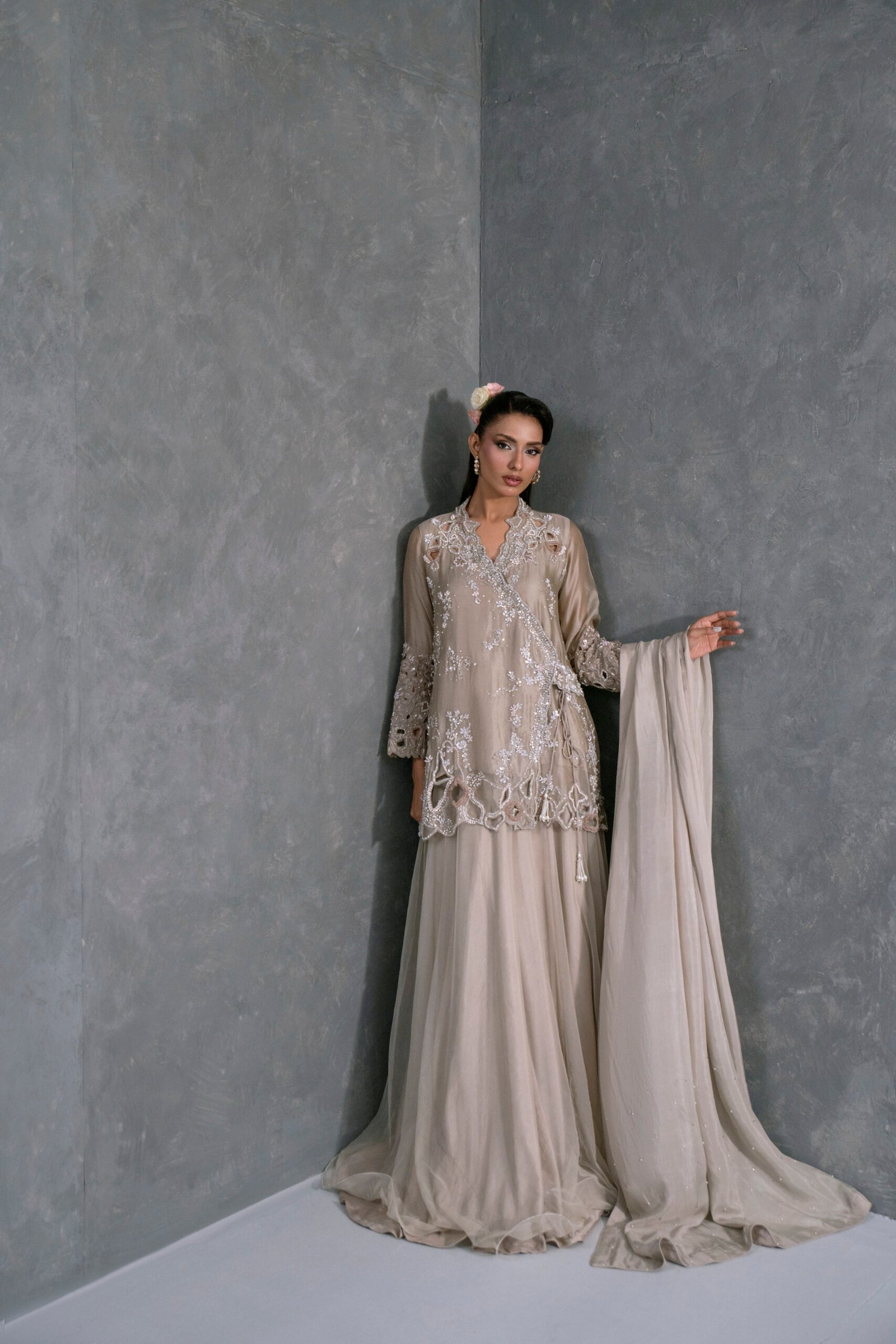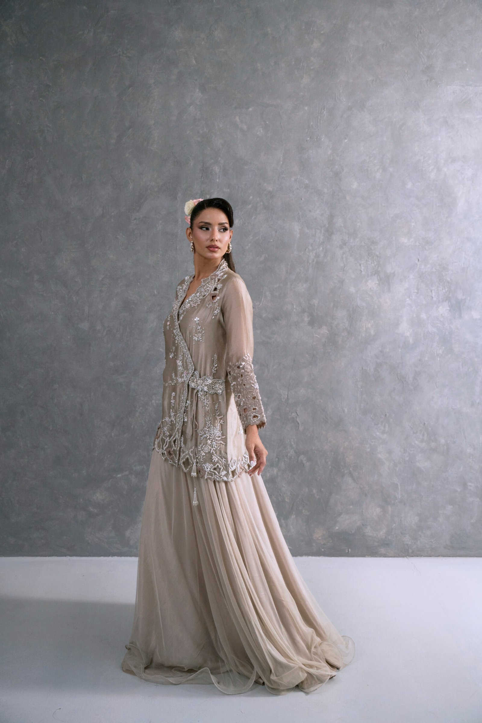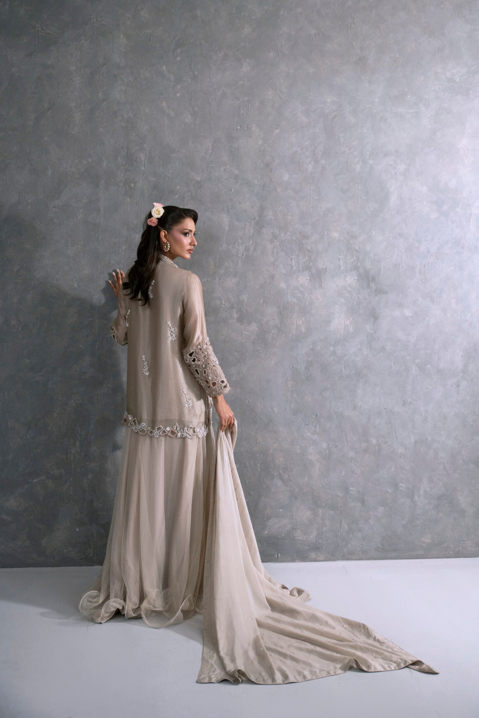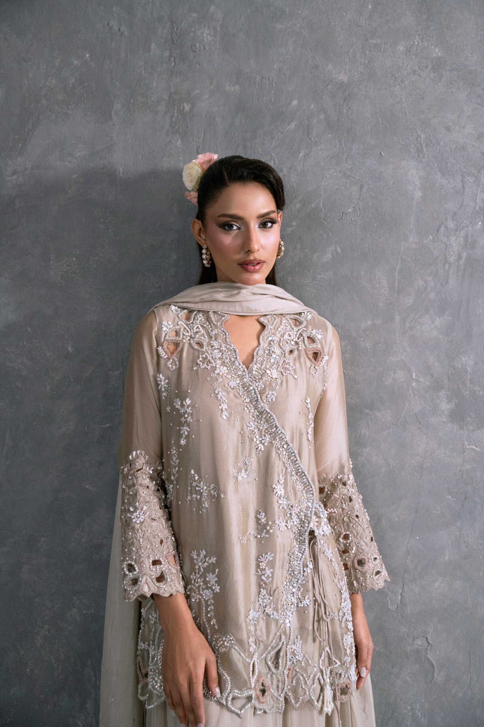 Shirt: Gold beige self-sleeve silk short style angrakha with cut work, pearls, sequin bronze and silver embellished work.