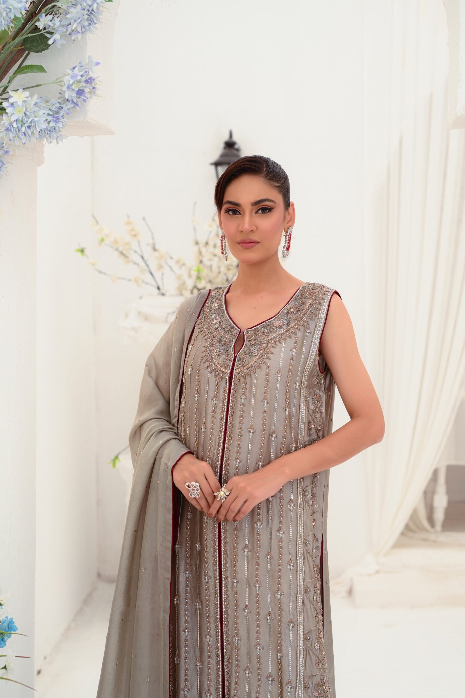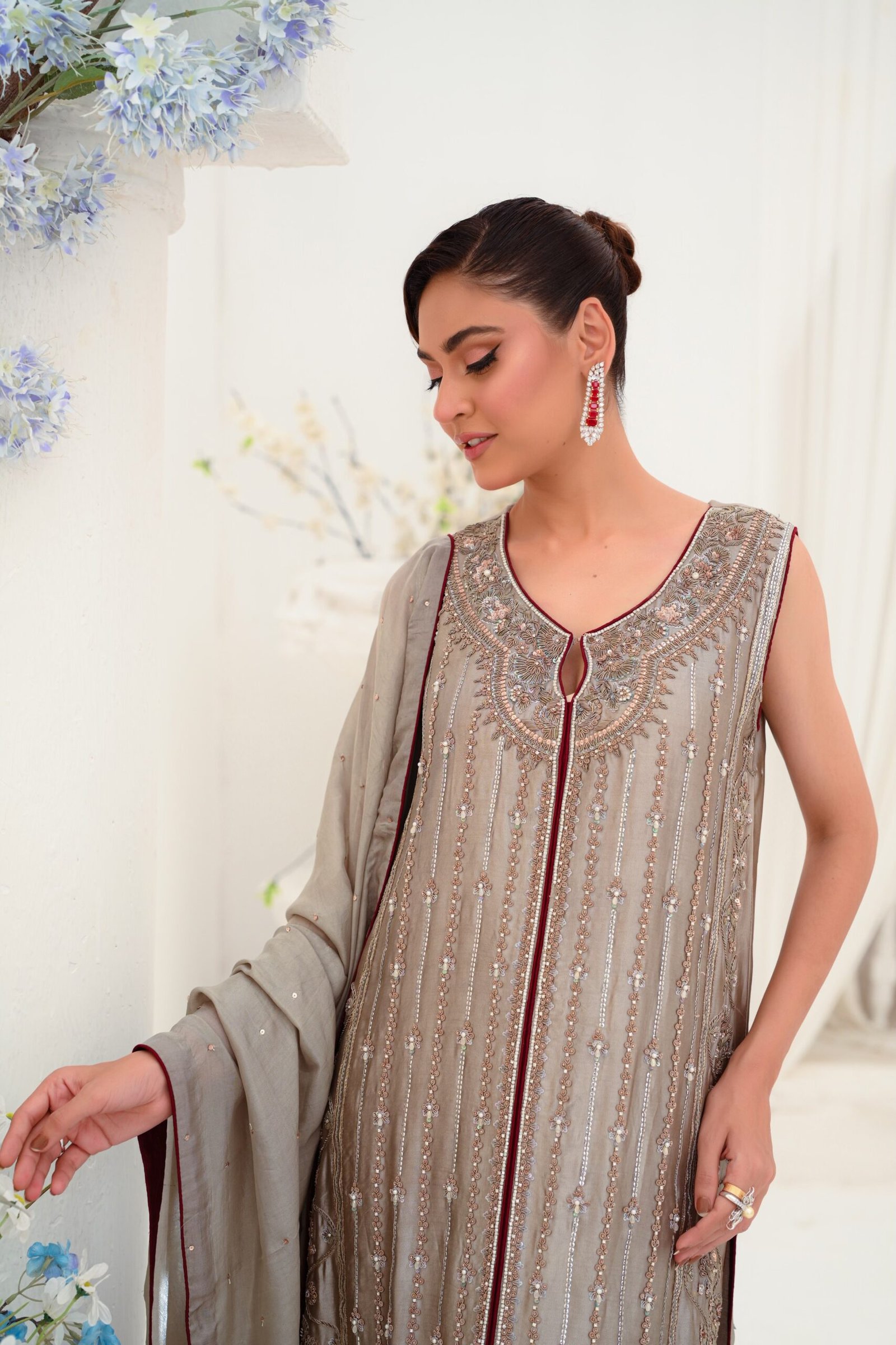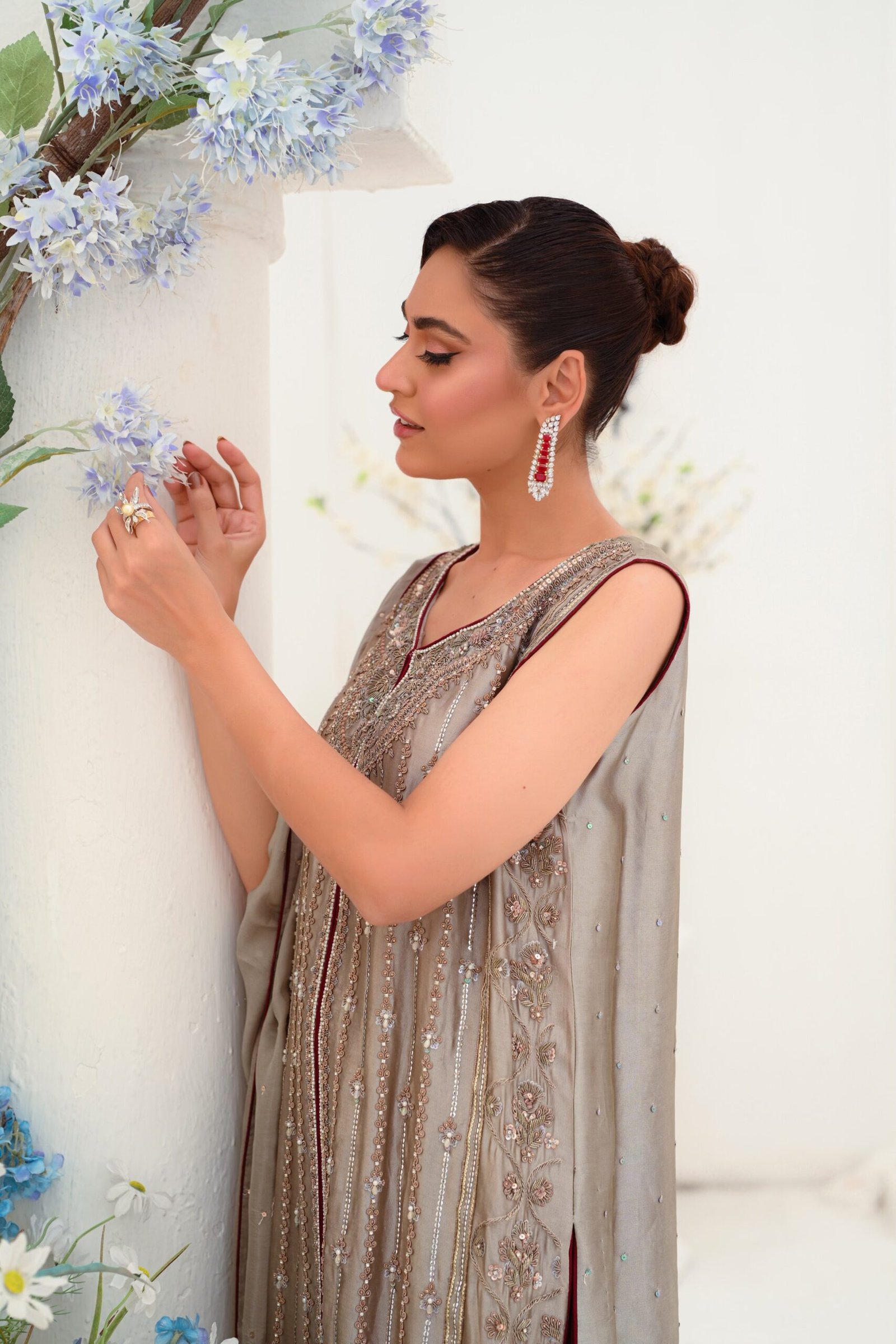 Indulge in the opulence of our timeless silk front open shirt adorned with intricate zardozi and reshum embroidery and velvet appliqué on the daman and side add an unparalleled level of craftsmanship. Pair it with silk dupatta with chun and boti and semi raw silk pants.