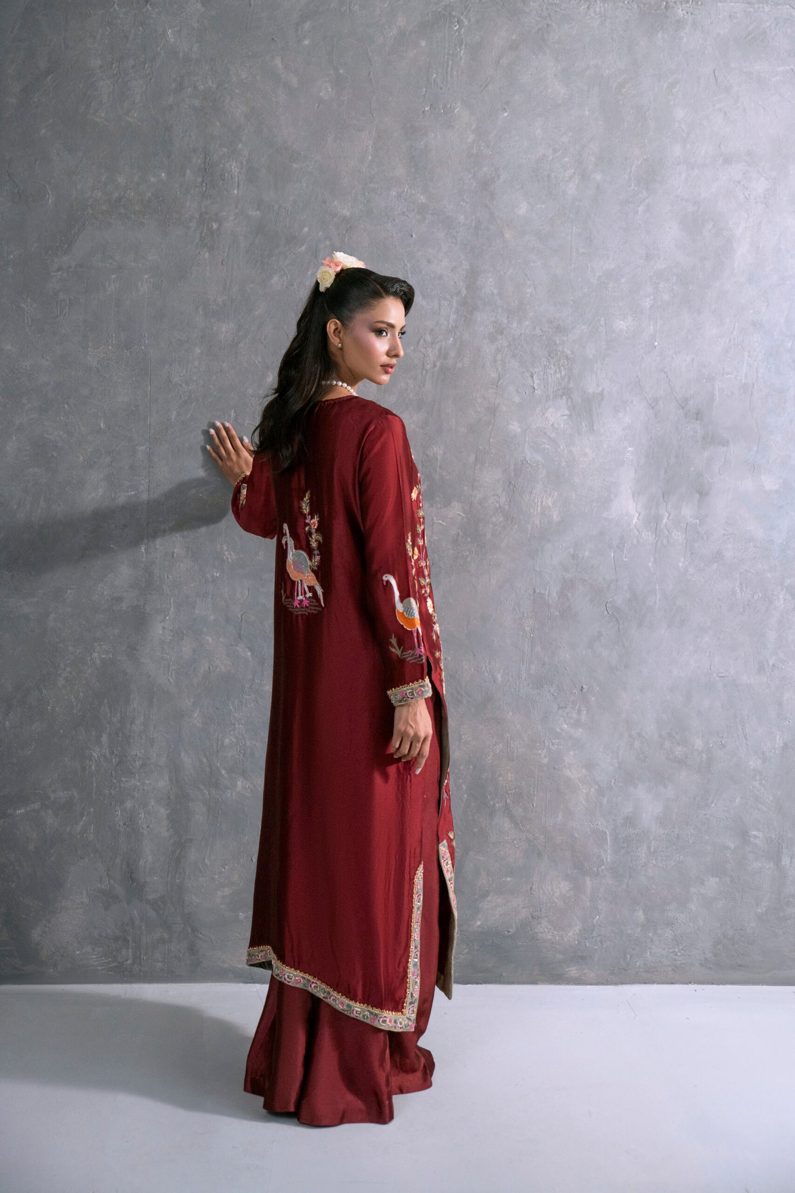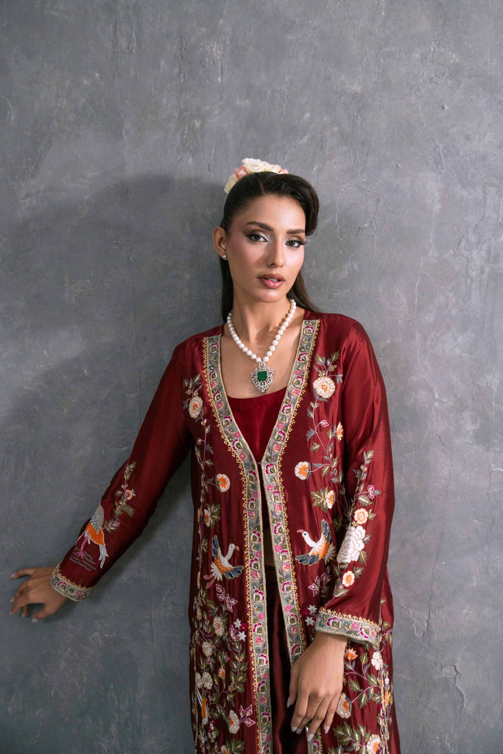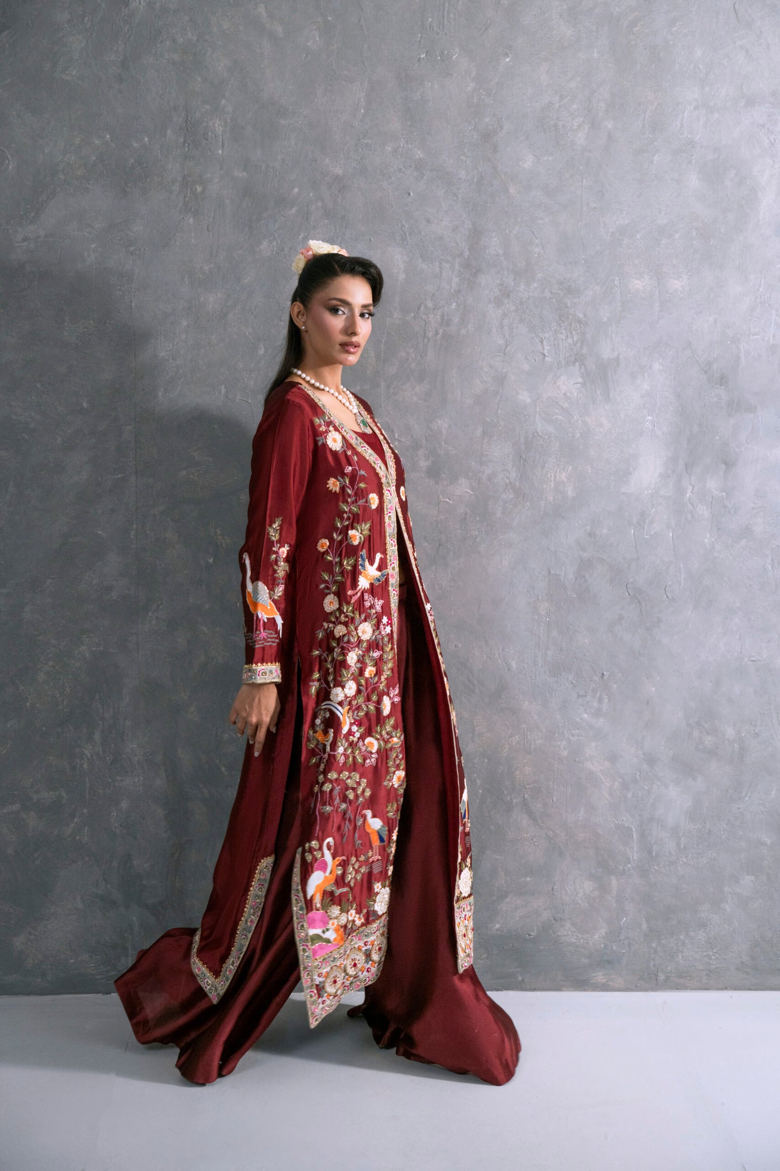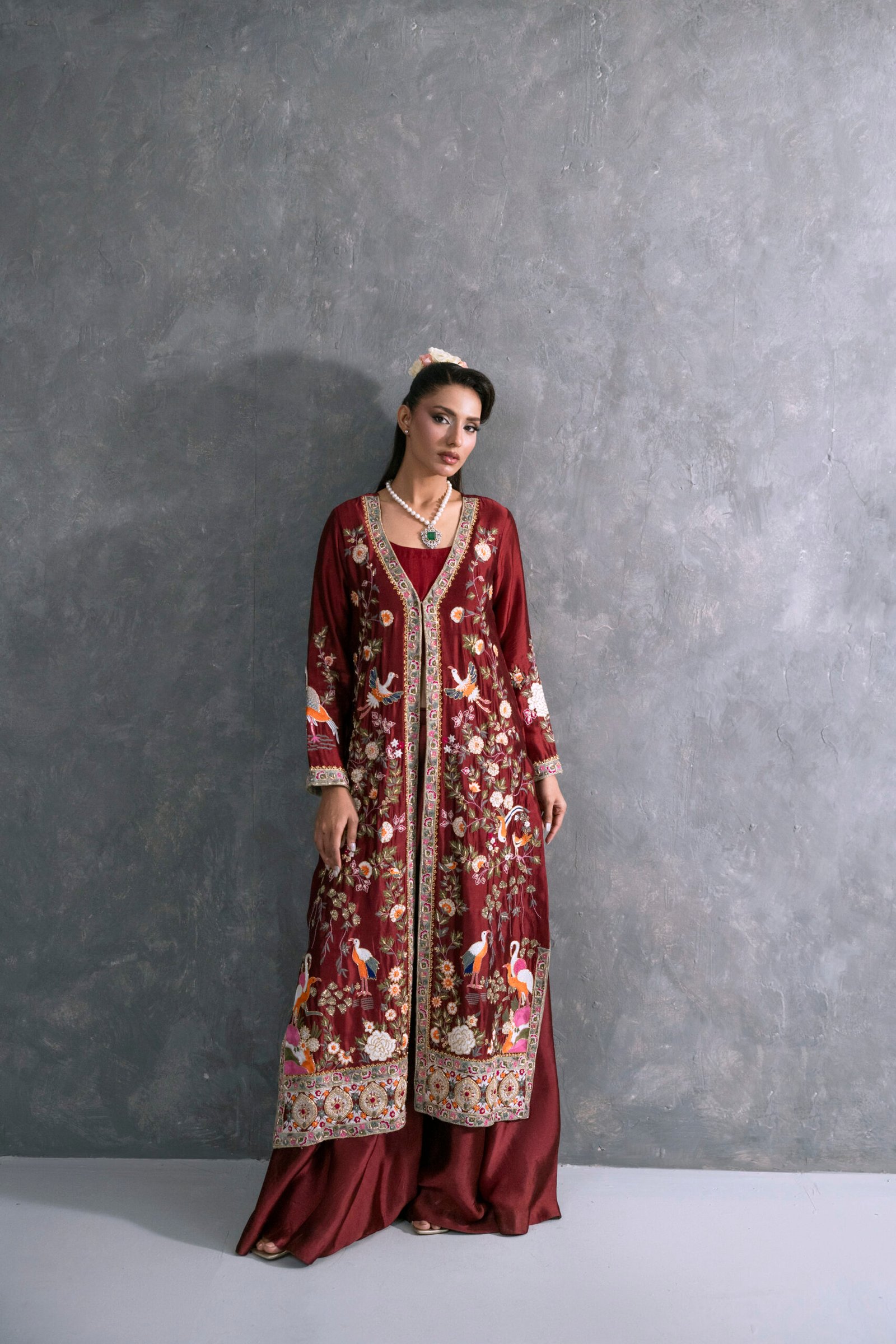 Maroon red sheesha silk coat is an instant head-turner featuring multi resham embroidery with zardozi work in complementing hue. It is styled with a matching crafted blouse.