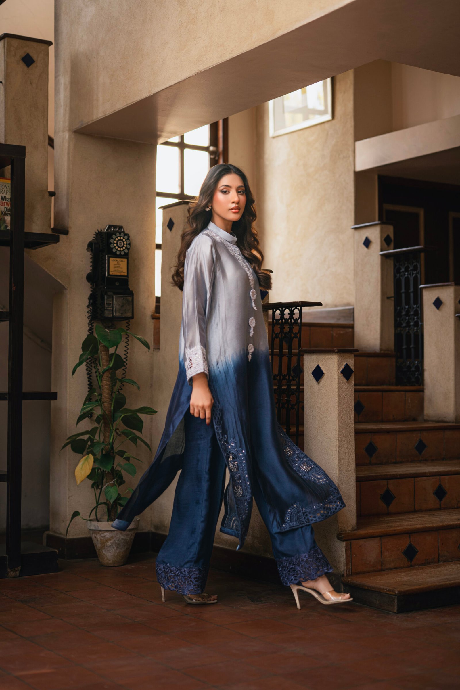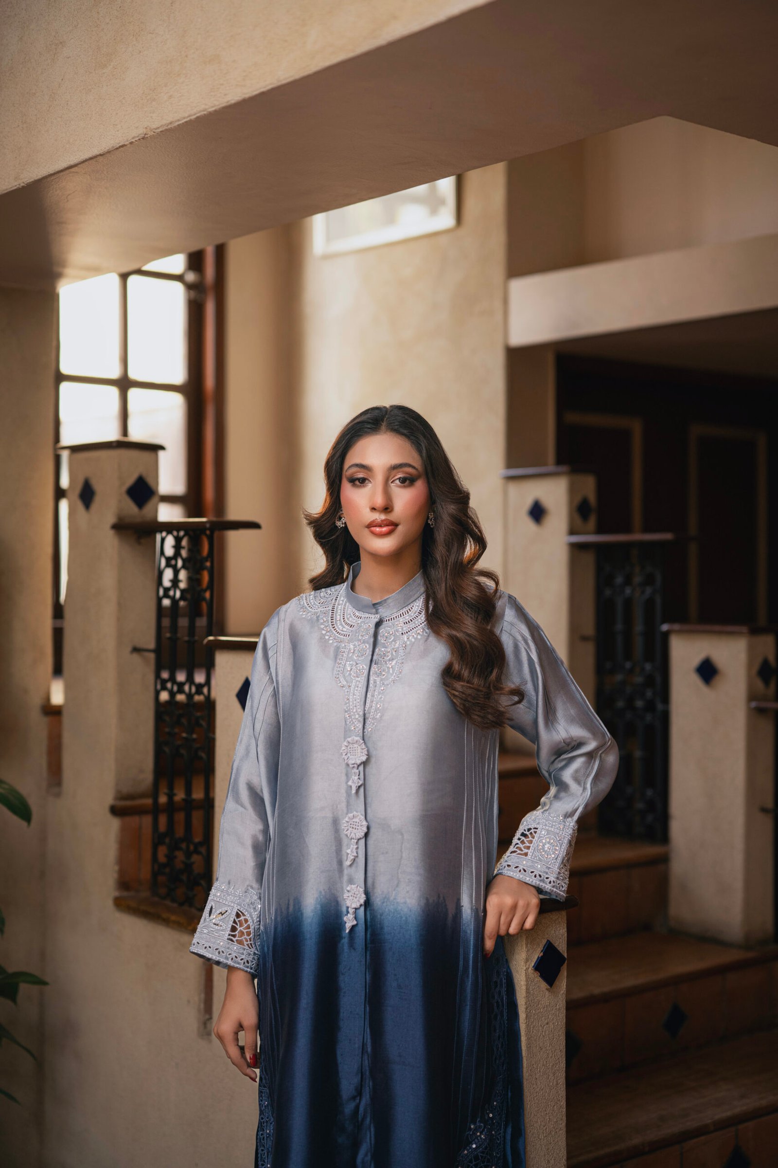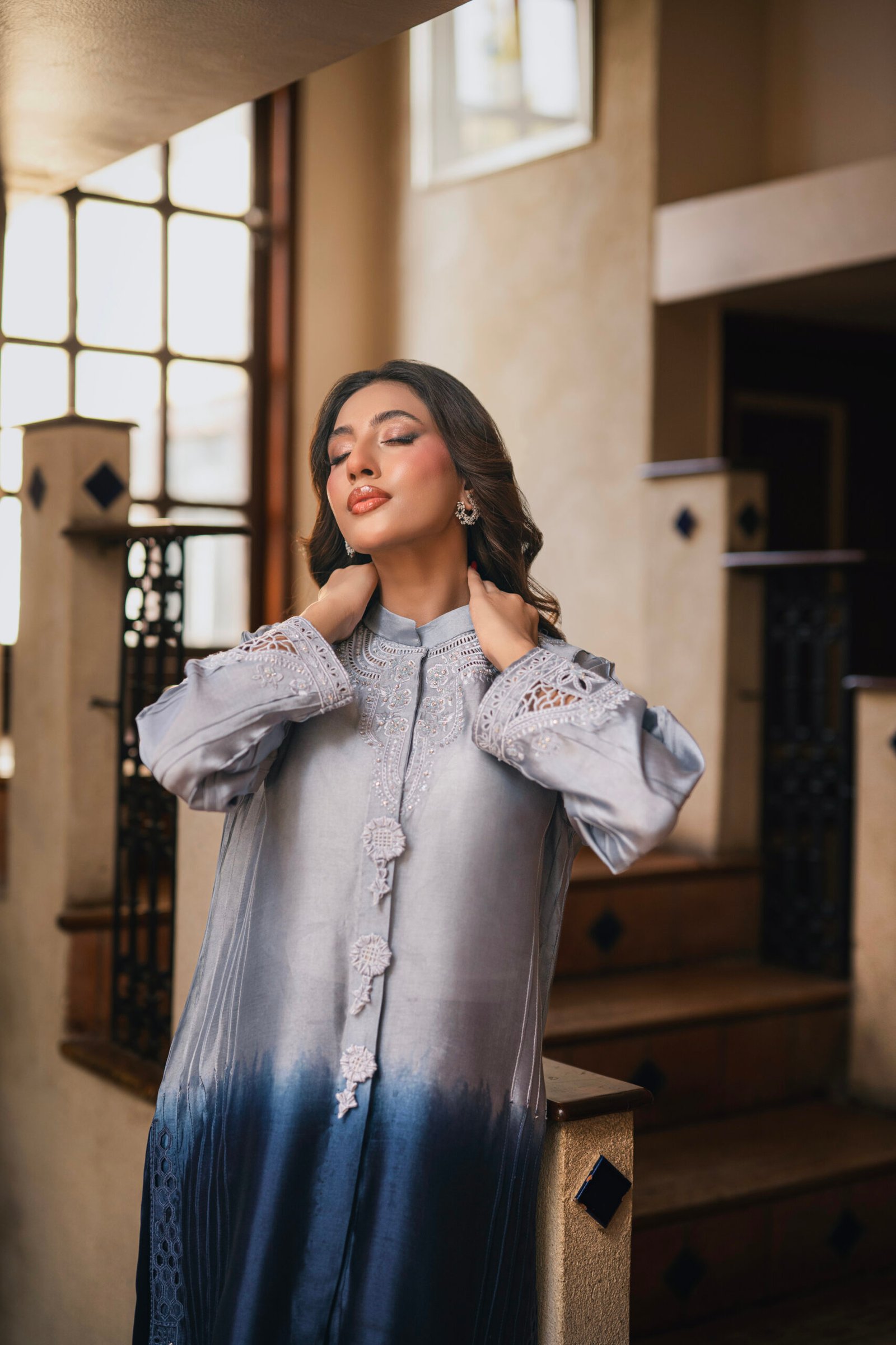 This blue ombre pure Shisha silk front open shirt with intricate cutwork and hand Emboridary details is prefect outfit for your Eid