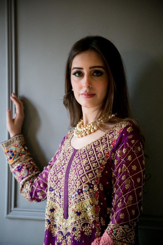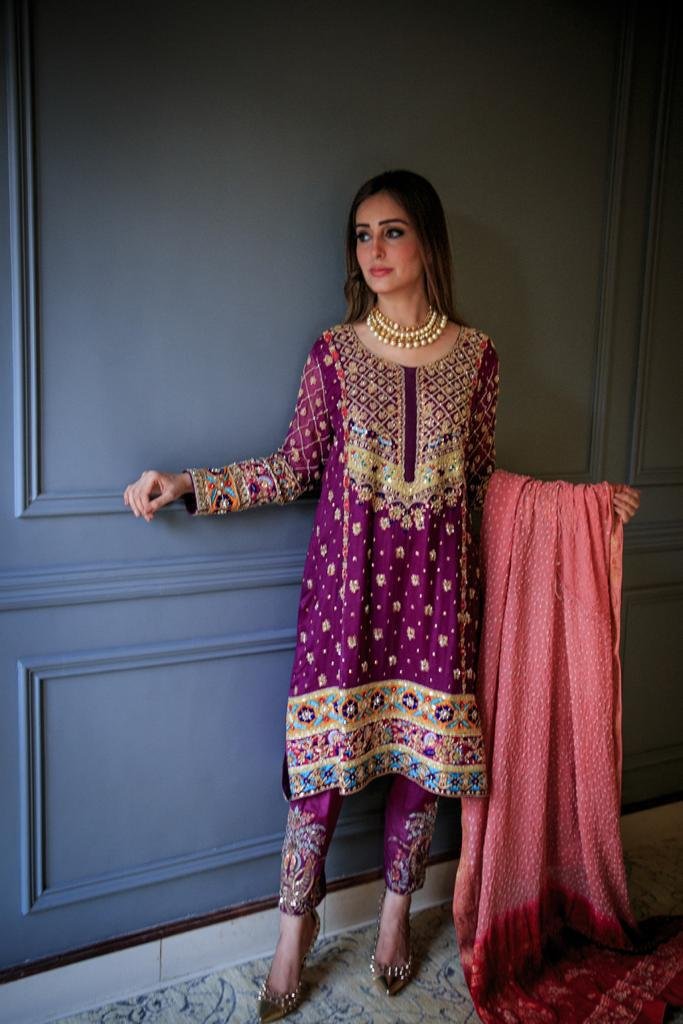 Cotton net shirt with lace applique, machine and hand embroidery. The outfit is paired with semi pure silk pants and semi pure crushed dupatta with lace.