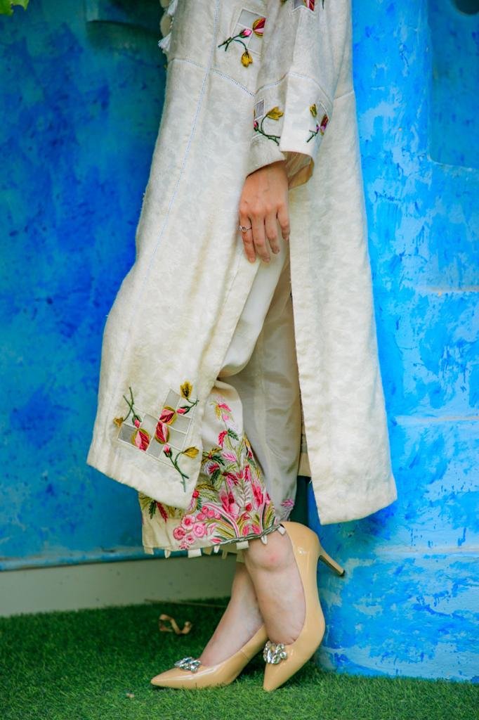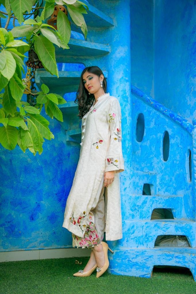 Silk cotton net shirt with embroidery, paired with semi pure culottes and a shaded organza dupatta.